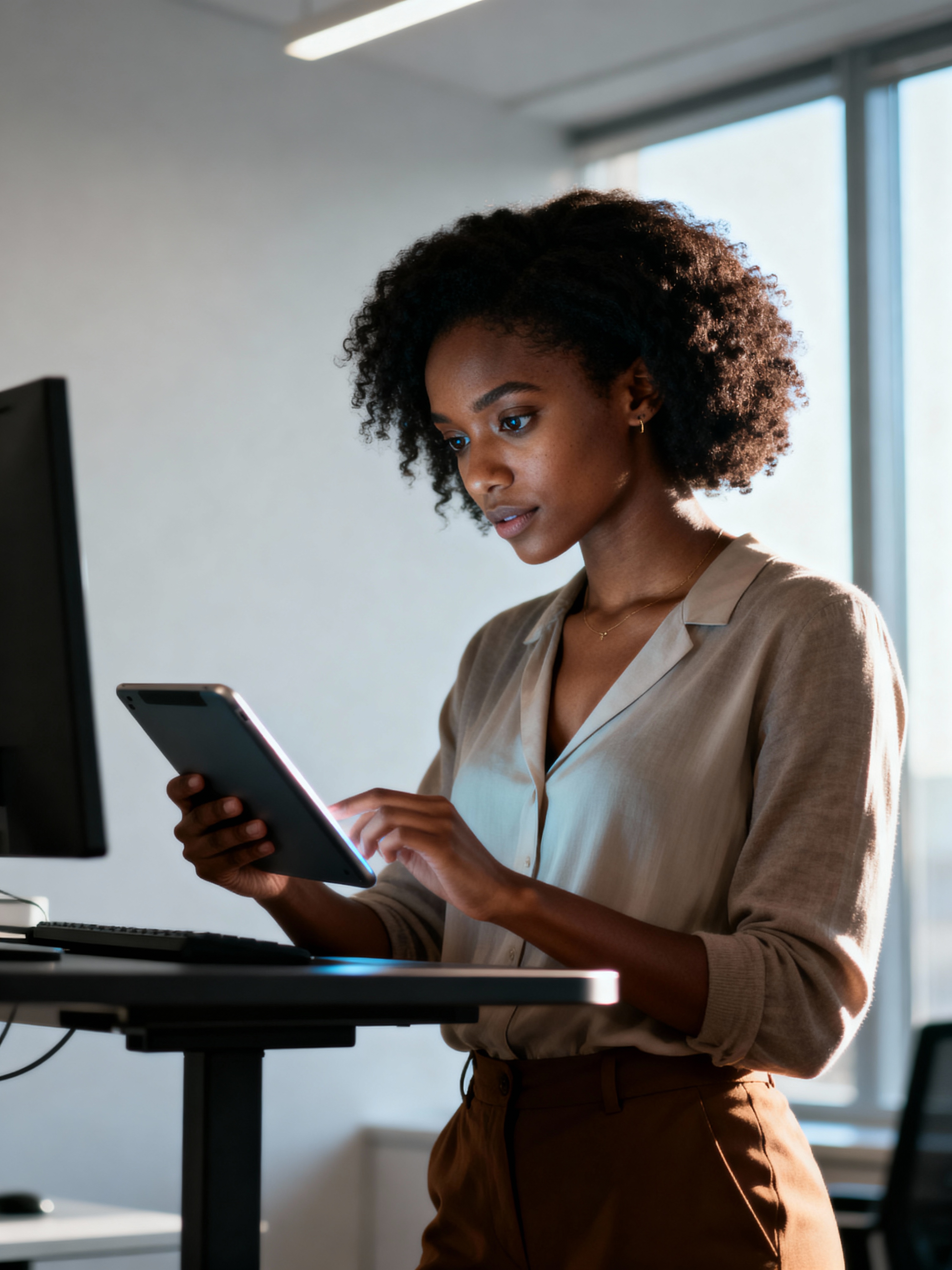focused model in elegant yet comfortable business casual ensemble working with digital tablet, standing desk, minimalist office, soft natural light