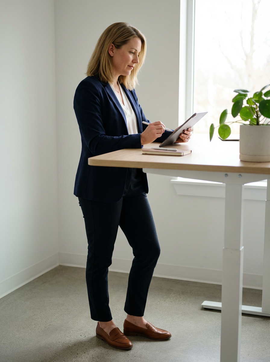 focused model in elegant yet comfortable business casual ensemble working with digital tablet, standing desk, minimalist office, soft natural light