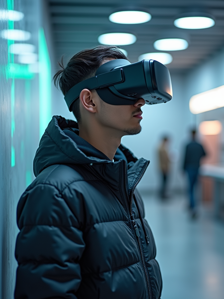 forward-thinking model dressed in innovative casual wear with tech accessories with VR headset or futuristic technology, innovation lab setting