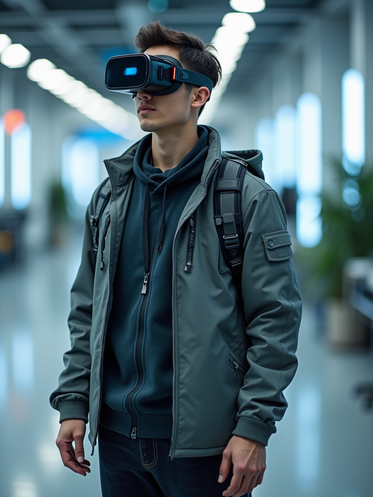 forward-thinking model dressed in innovative casual wear with tech accessories with VR headset or futuristic technology, innovation lab setting