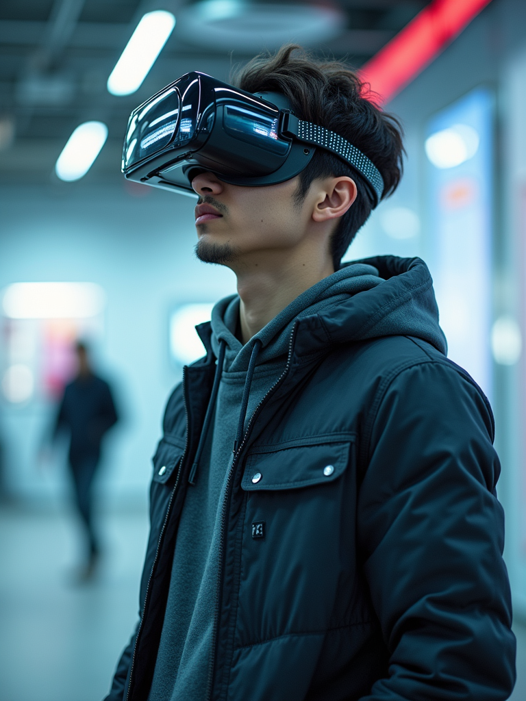 forward-thinking model dressed in innovative casual wear with tech accessories with VR headset or futuristic technology, innovation lab setting