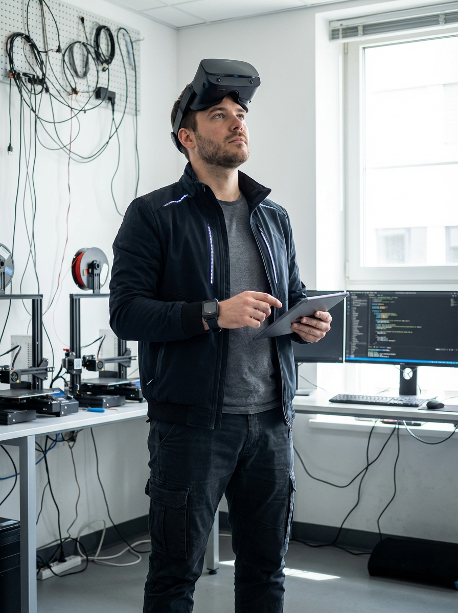 forward-thinking model dressed in innovative casual wear with tech accessories with VR headset or futuristic technology, innovation lab setting