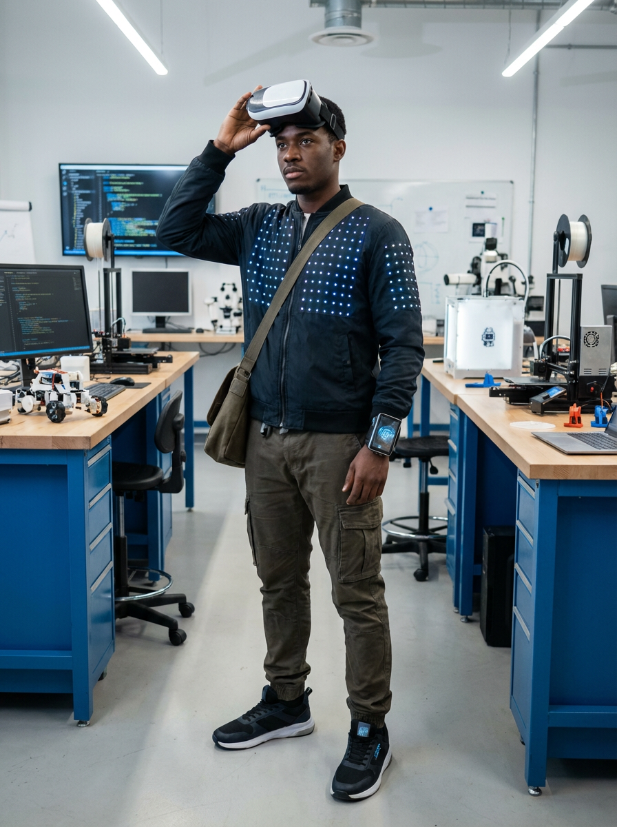 forward-thinking model dressed in innovative casual wear with tech accessories with VR headset or futuristic technology, innovation lab setting