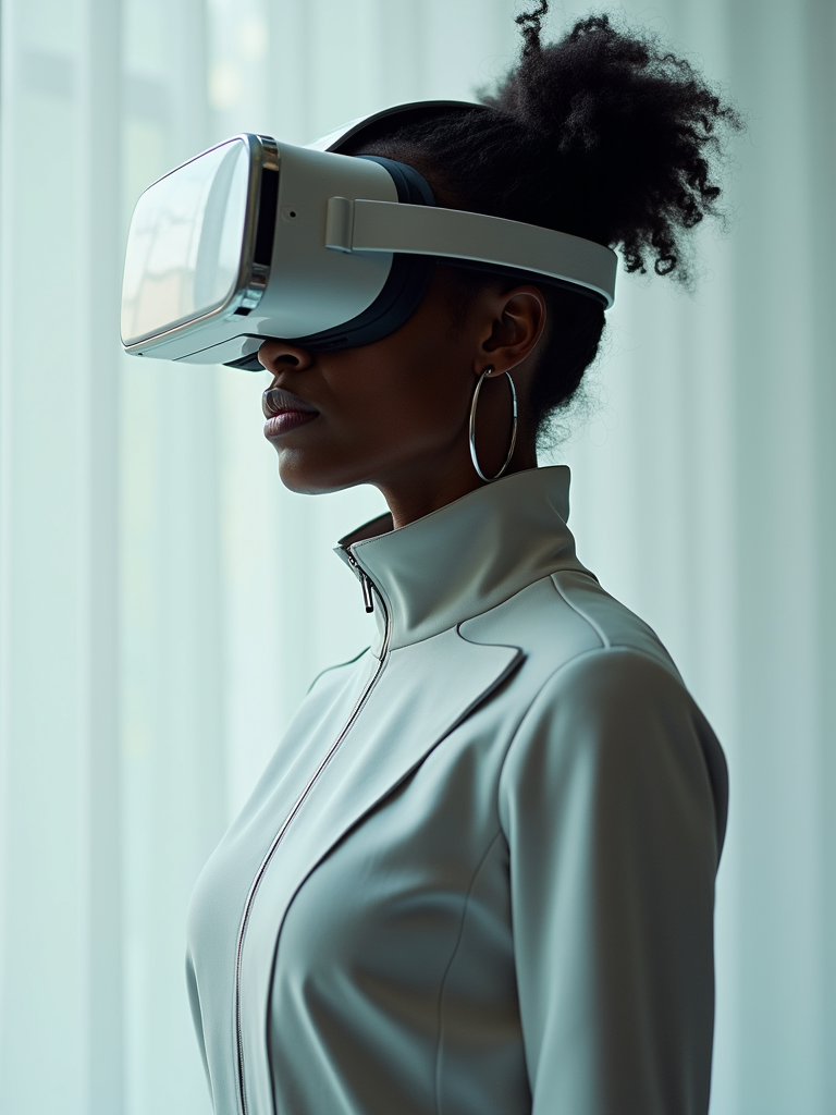 forward-thinking model dressed in modern minimalist outfit with sleek design elements with VR headset or futuristic technology, innovation lab setting