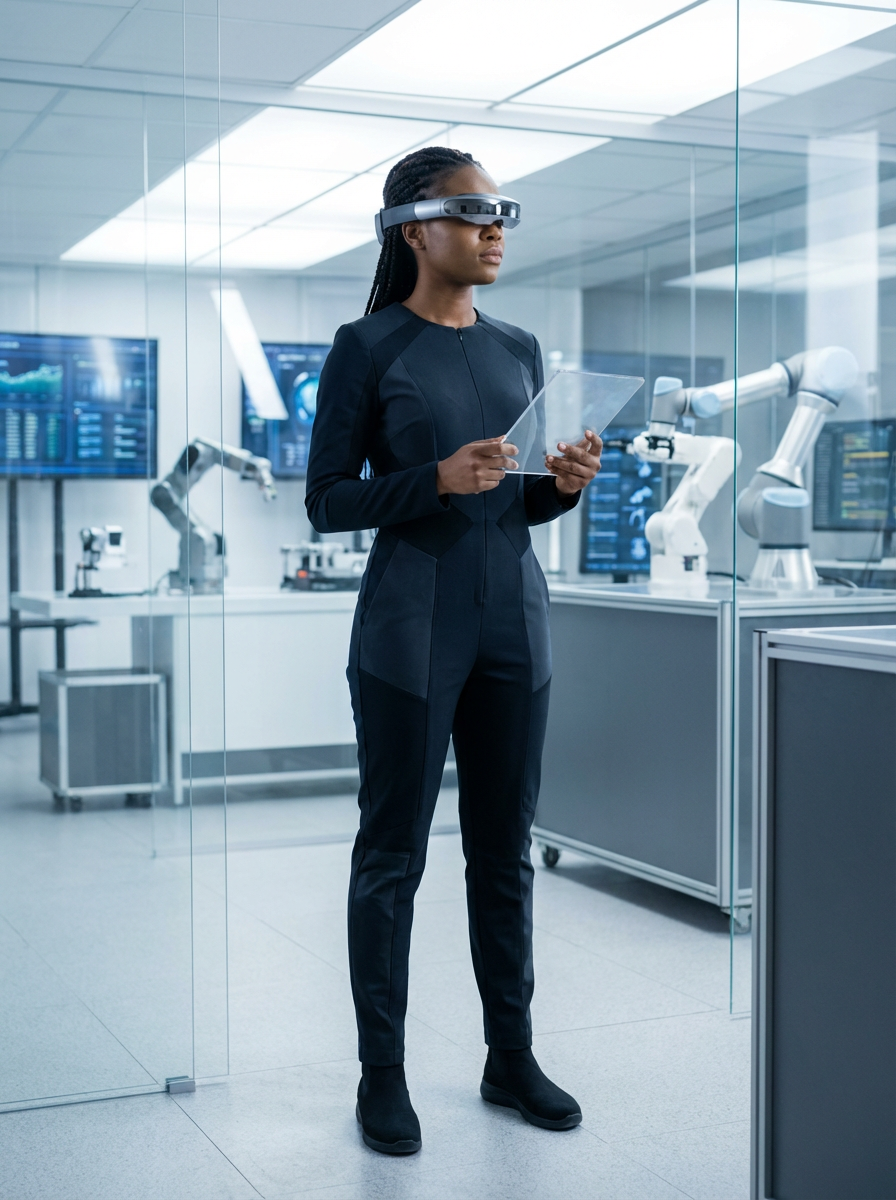 forward-thinking model dressed in modern minimalist outfit with sleek design elements with VR headset or futuristic technology, innovation lab setting