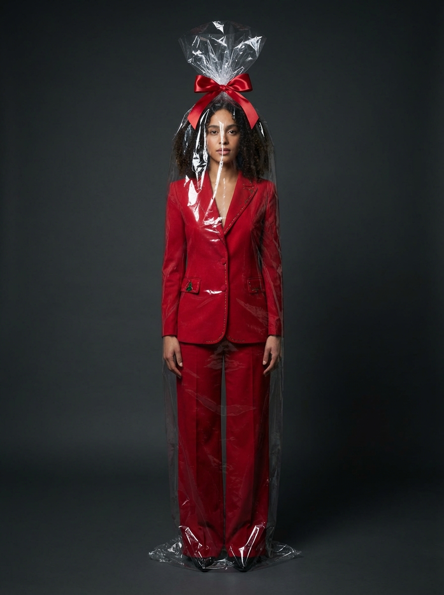{"frame": {"aspect_ratio": "3:4", "shot_size": "Full Shot (FS)", "orientation": "Portrait", "composition_guide": "Center Framed"}, "subject": {"subject_type": "Human", "identity_summary": "Same person as the input photo; keep age, gender expression, face, skin tone, and hair identical.", "visual_signature": {"facial_signature": {"face_shape": "Match reference exactly", "eye_details": "Match reference exactly", "nose_details": "Match reference exactly", "lip_details": "Match reference exactly", "cheek_and_jaw": "Match reference exactly", "unique_features": "Keep all facial details from the reference; do not change identity."}, "body_signature": {"build": "Same body type as reference", "proportions": "Natural, realistic", "skin_tone_and_texture": "Match reference skin tone, hyper-realistic", "height_estimation_cm": 165, "unique_markings": "Copy any visible markings from reference if exposed."}}, "pose_and_action": {"description": "Standing upright like a wrapped gift.", "body_position": "Full body, centered, standing straight.", "limb_positions": "Arms relaxed along the sides inside the wrapping.", "hand_gestures": "Natural, relaxed fingers.", "facial_expression": "Calm, neutral or slight smile.", "gaze_direction": "Looking straight at camera."}, "inventory": {"wardrobe": "Christmas-themed red women’s suit: tailored red blazer with light festive details, matching high-waisted wide-leg trousers. Smooth, premium fabric, no logos or text.", "accessories": "Minimal, elegant jewelry only if it matches the reference style.", "held_objects": "None.", "hair_style": "Same hair as reference, styled neatly and visible inside the wrapping."}}, "environment": {"setting_type": "Indoor", "location_description": "Professional studio with a clean, seamless backdrop.", "time_of_day": "N/A (studio)", "weather_conditions": "N/A", "background_elements": "Plain deep background, no extra props."}, "lighting": {"global_illumination": "Controlled studio light.", "primary_source": "Softbox above and in front.", "direction": "Mostly frontal with slight angle.", "shadow_quality": "Soft, diffused shadows; subtle reflections on plastic.", "color_temperature": "Neutral daylight."}, "camera": {"angle": "Eye Level", "lens_type": "Standard 50mm", "focal_length_mm": 50, "aperture": "f/4"}, "special_elements": {"wrapping_description": "Subject fully enclosed in tall, shiny, transparent gift cellophane from floor to above the head, with realistic folds and reflections.", "bow_description": "Large satin red gift bow where the plastic gathers above the head, matching the red suit.", "ground_interaction": "Wrapping touches the floor and bunches slightly around the feet."}, "post_processing": {"art_medium": "Photography", "style_modifiers": "Hyper-realistic, high-end fashion, Christmas gift concept", "color_grade": "Deep blacks, rich but natural reds, clear highlights on plastic.", "rendering_engine": "Photorealistic, 8K", "quality_boosters": "Ultra-detailed textures, sharp focus, no noise."}, "negative": {"artifact_suppression": "bad anatomy, extra limbs, extra fingers, warped plastic, text, watermark, logo, glitch, blur, low resolution, bad geometry", "subject_excludes": "cartoon style, 3D render look, changed identity, different clothing colors, Santa hat costume, outdoor setting, busy background, extra people, cropped body"}}