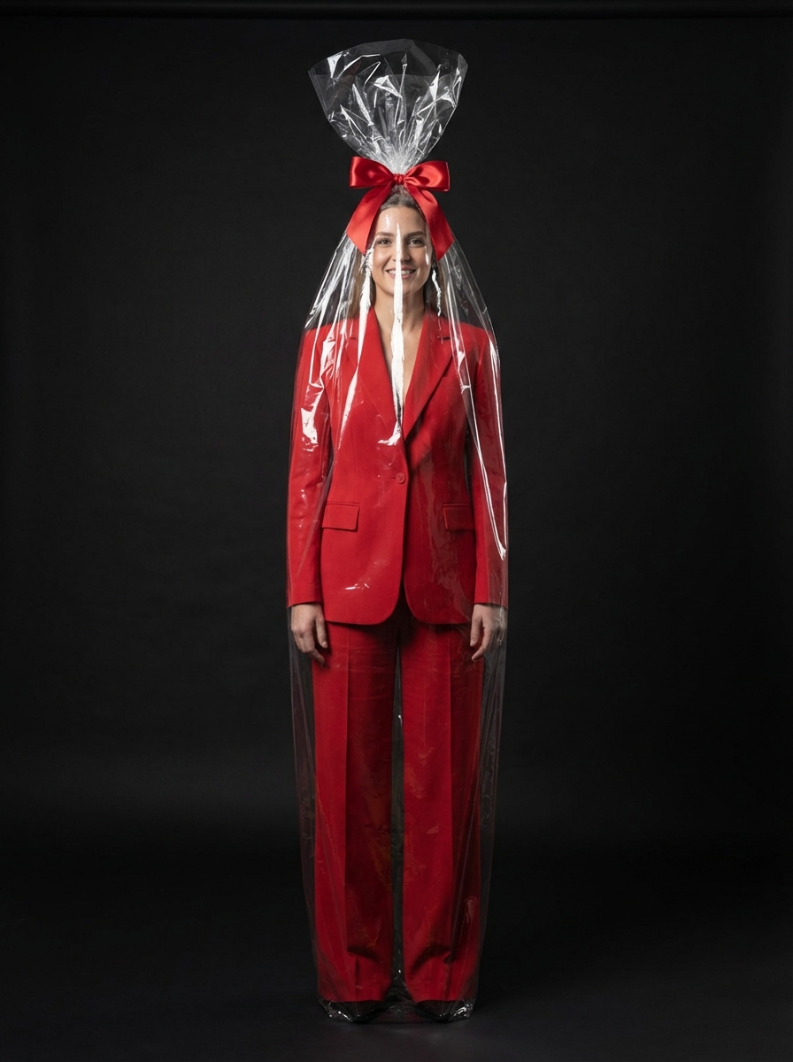 {"frame": {"aspect_ratio": "3:4", "shot_size": "Full Shot (FS)", "orientation": "Portrait", "composition_guide": "Center Framed"}, "subject": {"subject_type": "Human", "identity_summary": "Same person as the input photo; keep age, gender expression, face, skin tone, and hair identical.", "visual_signature": {"facial_signature": {"face_shape": "Match reference exactly", "eye_details": "Match reference exactly", "nose_details": "Match reference exactly", "lip_details": "Match reference exactly", "cheek_and_jaw": "Match reference exactly", "unique_features": "Keep all facial details from the reference; do not change identity."}, "body_signature": {"build": "Same body type as reference", "proportions": "Natural, realistic", "skin_tone_and_texture": "Match reference skin tone, hyper-realistic", "height_estimation_cm": 165, "unique_markings": "Copy any visible markings from reference if exposed."}}, "pose_and_action": {"description": "Standing upright like a wrapped gift.", "body_position": "Full body, centered, standing straight.", "limb_positions": "Arms relaxed along the sides inside the wrapping.", "hand_gestures": "Natural, relaxed fingers.", "facial_expression": "Calm, neutral or slight smile.", "gaze_direction": "Looking straight at camera."}, "inventory": {"wardrobe": "Christmas-themed red women’s suit: tailored red blazer with light festive details, matching high-waisted wide-leg trousers. Smooth, premium fabric, no logos or text.", "accessories": "Minimal, elegant jewelry only if it matches the reference style.", "held_objects": "None.", "hair_style": "Same hair as reference, styled neatly and visible inside the wrapping."}}, "environment": {"setting_type": "Indoor", "location_description": "Professional studio with a clean, seamless backdrop.", "time_of_day": "N/A (studio)", "weather_conditions": "N/A", "background_elements": "Plain deep background, no extra props."}, "lighting": {"global_illumination": "Controlled studio light.", "primary_source": "Softbox above and in front.", "direction": "Mostly frontal with slight angle.", "shadow_quality": "Soft, diffused shadows; subtle reflections on plastic.", "color_temperature": "Neutral daylight."}, "camera": {"angle": "Eye Level", "lens_type": "Standard 50mm", "focal_length_mm": 50, "aperture": "f/4"}, "special_elements": {"wrapping_description": "Subject fully enclosed in tall, shiny, transparent gift cellophane from floor to above the head, with realistic folds and reflections.", "bow_description": "Large satin red gift bow where the plastic gathers above the head, matching the red suit.", "ground_interaction": "Wrapping touches the floor and bunches slightly around the feet."}, "post_processing": {"art_medium": "Photography", "style_modifiers": "Hyper-realistic, high-end fashion, Christmas gift concept", "color_grade": "Deep blacks, rich but natural reds, clear highlights on plastic.", "rendering_engine": "Photorealistic, 8K", "quality_boosters": "Ultra-detailed textures, sharp focus, no noise."}, "negative": {"artifact_suppression": "bad anatomy, extra limbs, extra fingers, warped plastic, text, watermark, logo, glitch, blur, low resolution, bad geometry", "subject_excludes": "cartoon style, 3D render look, changed identity, different clothing colors, Santa hat costume, outdoor setting, busy background, extra people, cropped body"}}