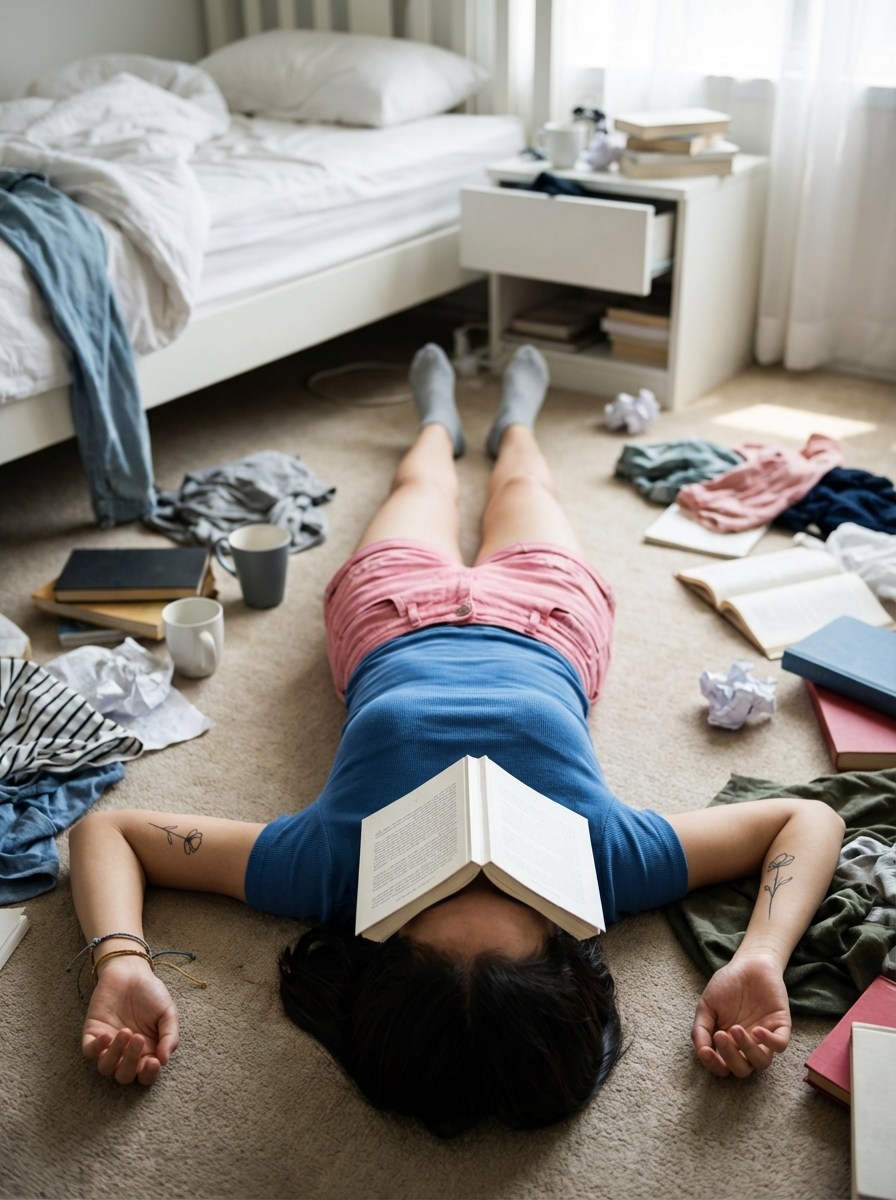 {"frame": {"aspect_ratio": "3:4", "shot_size": "Full Shot (FS)", "orientation": "Portrait", "composition_guide": "Center Framed"}, "subject": {"subject_type": "Human", "identity_summary": "Young model, consistent with previous image, pose and book on face preserved.", "visual_signature": {"facial_signature": {"face_shape": "Obscured by object", "eye_details": "Obscured", "nose_details": "Obscured", "lip_details": "Obscured", "cheek_and_jaw": "Jawline partially visible, tone", "unique_features": "Face is completely covered by an open book resting on the head."}, "body_signature": {"build": "Slender/Slim", "proportions": "Natural, youthful", "skin_tone_and_texture": "Fair, smooth skin texture", "height_estimation_cm": 165, "unique_markings": "Small line-art tattoo (flower/rose design) on left inner forearm."}}, "pose_and_action": {"description": "Lying supine (face up) on the floor, resting.", "body_position": "Torso flat against the floor, aligned vertically in frame.", "limb_positions": "Arms relaxed at sides on the floor. Legs extended straight.", "hand_gestures": "Relaxed fingers.", "facial_expression": "Hidden behind book.", "gaze_direction": "Obscured."}, "inventory": {"wardrobe": "Blue fitted t-shirt. Pink denim shorts.", "accessories": "Two thin cord bracelets on left wrist. ankle socks (no shoes).", "held_objects": "paperback book (open, resting face-down over subject's face).", "hair_style": "Short dark brown/hair, barely visible beneath the book."}}, "environment": {"setting_type": "Indoor", "location_description": "A cluttered, messy bedroom floor. Carpeted or wooden floor partially covered with clothes, books, empty mugs, charging cables, and crumpled paper. A rumpled bed and an overflowing nightstand are visible in the background.", "time_of_day": "Daytime", "weather_conditions": "N/A (Indoor)", "background_elements": "Piles of laundry, open backpack, shoes scattered, unmade bed with rumpled duvet, posters on a wall."}, "lighting": {"global_illumination": "Soft, ambient indoor light", "primary_source": "Window light (from side)", "direction": "Side-lit", "shadow_quality": "Soft, diffused shadows from objects on the floor.", "color_temperature": "Neutral (Daylight)"}, "camera": {"angle": "High Angle (Looking down)", "lens_type": "35mm Wide Angle", "focal_length_mm": 35, "aperture": "f/2.8 (Shallow Depth of Field, focusing on subject)"}, "post_processing": {"art_medium": "Photography", "style_modifiers": "Candid, Realistic, 'Lived-in' aesthetic", "color_grade": "Neutral colors, slightly desaturated", "rendering_engine": "Photorealistic", "quality_boosters": "Highly detailed clutter textures, sharp focus on clothing"}, "negative": {"artifact_suppression": "bad anatomy, extra fingers, text, watermark, bad geometry", "subject_excludes": "visible face, eyes, nose, mouth, standing pose, sitting pose, clean room, outdoor elements"}}
