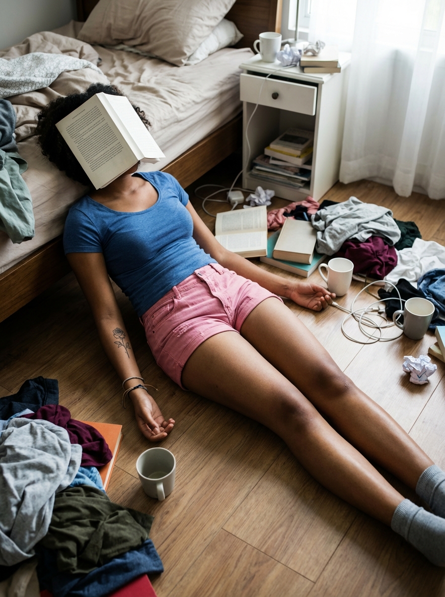 {"frame": {"aspect_ratio": "3:4", "shot_size": "Full Shot (FS)", "orientation": "Portrait", "composition_guide": "Center Framed"}, "subject": {"subject_type": "Human", "identity_summary": "Young model, consistent with previous image, pose and book on face preserved.", "visual_signature": {"facial_signature": {"face_shape": "Obscured by object", "eye_details": "Obscured", "nose_details": "Obscured", "lip_details": "Obscured", "cheek_and_jaw": "Jawline partially visible, tone", "unique_features": "Face is completely covered by an open book resting on the head."}, "body_signature": {"build": "Slender/Slim", "proportions": "Natural, youthful", "skin_tone_and_texture": "Fair, smooth skin texture", "height_estimation_cm": 165, "unique_markings": "Small line-art tattoo (flower/rose design) on left inner forearm."}}, "pose_and_action": {"description": "Lying supine (face up) on the floor, resting.", "body_position": "Torso flat against the floor, aligned vertically in frame.", "limb_positions": "Arms relaxed at sides on the floor. Legs extended straight.", "hand_gestures": "Relaxed fingers.", "facial_expression": "Hidden behind book.", "gaze_direction": "Obscured."}, "inventory": {"wardrobe": "Blue fitted t-shirt. Pink denim shorts.", "accessories": "Two thin cord bracelets on left wrist. ankle socks (no shoes).", "held_objects": "paperback book (open, resting face-down over subject's face).", "hair_style": "Short dark brown/hair, barely visible beneath the book."}}, "environment": {"setting_type": "Indoor", "location_description": "A cluttered, messy bedroom floor. Carpeted or wooden floor partially covered with clothes, books, empty mugs, charging cables, and crumpled paper. A rumpled bed and an overflowing nightstand are visible in the background.", "time_of_day": "Daytime", "weather_conditions": "N/A (Indoor)", "background_elements": "Piles of laundry, open backpack, shoes scattered, unmade bed with rumpled duvet, posters on a wall."}, "lighting": {"global_illumination": "Soft, ambient indoor light", "primary_source": "Window light (from side)", "direction": "Side-lit", "shadow_quality": "Soft, diffused shadows from objects on the floor.", "color_temperature": "Neutral (Daylight)"}, "camera": {"angle": "High Angle (Looking down)", "lens_type": "35mm Wide Angle", "focal_length_mm": 35, "aperture": "f/2.8 (Shallow Depth of Field, focusing on subject)"}, "post_processing": {"art_medium": "Photography", "style_modifiers": "Candid, Realistic, 'Lived-in' aesthetic", "color_grade": "Neutral colors, slightly desaturated", "rendering_engine": "Photorealistic", "quality_boosters": "Highly detailed clutter textures, sharp focus on clothing"}, "negative": {"artifact_suppression": "bad anatomy, extra fingers, text, watermark, bad geometry", "subject_excludes": "visible face, eyes, nose, mouth, standing pose, sitting pose, clean room, outdoor elements"}}