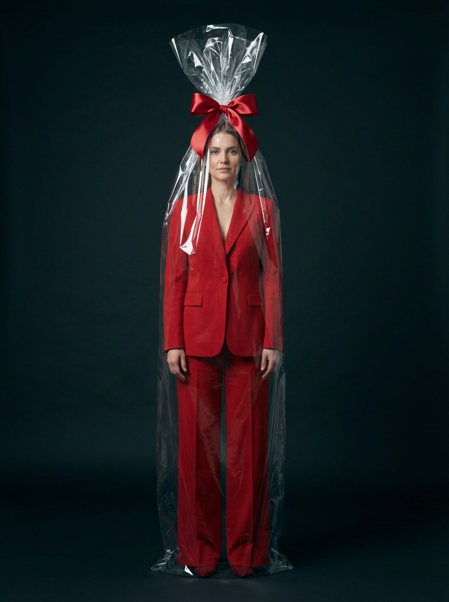 {"frame": {"aspect_ratio": "3:4", "shot_size": "Full Shot (FS)", "orientation": "Portrait", "composition_guide": "Center Framed"}, "subject": {"subject_type": "Human", "identity_summary": "Same person as the input photo; keep age, gender expression, face, skin tone, and hair identical.", "visual_signature": {"facial_signature": {"face_shape": "Match reference exactly", "eye_details": "Match reference exactly", "nose_details": "Match reference exactly", "lip_details": "Match reference exactly", "cheek_and_jaw": "Match reference exactly", "unique_features": "Keep all facial details from the reference; do not change identity."}, "body_signature": {"build": "Same body type as reference", "proportions": "Natural, realistic", "skin_tone_and_texture": "Match reference skin tone, hyper-realistic", "height_estimation_cm": 165, "unique_markings": "Copy any visible markings from reference if exposed."}}, "pose_and_action": {"description": "Standing upright like a wrapped gift.", "body_position": "Full body, centered, standing straight.", "limb_positions": "Arms relaxed along the sides inside the wrapping.", "hand_gestures": "Natural, relaxed fingers.", "facial_expression": "Calm, neutral or slight smile.", "gaze_direction": "Looking straight at camera."}, "inventory": {"wardrobe": "Christmas-themed red women’s suit: tailored red blazer with light festive details, matching high-waisted wide-leg trousers. Smooth, premium fabric, no logos or text.", "accessories": "Minimal, elegant jewelry only if it matches the reference style.", "held_objects": "None.", "hair_style": "Same hair as reference, styled neatly and visible inside the wrapping."}}, "environment": {"setting_type": "Indoor", "location_description": "Professional studio with a clean, seamless backdrop.", "time_of_day": "N/A (studio)", "weather_conditions": "N/A", "background_elements": "Plain deep background, no extra props."}, "lighting": {"global_illumination": "Controlled studio light.", "primary_source": "Softbox above and in front.", "direction": "Mostly frontal with slight angle.", "shadow_quality": "Soft, diffused shadows; subtle reflections on plastic.", "color_temperature": "Neutral daylight."}, "camera": {"angle": "Eye Level", "lens_type": "Standard 50mm", "focal_length_mm": 50, "aperture": "f/4"}, "special_elements": {"wrapping_description": "Subject fully enclosed in tall, shiny, transparent gift cellophane from floor to above the head, with realistic folds and reflections.", "bow_description": "Large satin red gift bow where the plastic gathers above the head, matching the red suit.", "ground_interaction": "Wrapping touches the floor and bunches slightly around the feet."}, "post_processing": {"art_medium": "Photography", "style_modifiers": "Hyper-realistic, high-end fashion, Christmas gift concept", "color_grade": "Deep blacks, rich but natural reds, clear highlights on plastic.", "rendering_engine": "Photorealistic, 8K", "quality_boosters": "Ultra-detailed textures, sharp focus, no noise."}, "negative": {"artifact_suppression": "bad anatomy, extra limbs, extra fingers, warped plastic, text, watermark, logo, glitch, blur, low resolution, bad geometry", "subject_excludes": "cartoon style, 3D render look, changed identity, different clothing colors, Santa hat costume, outdoor setting, busy background, extra people, cropped body"}}