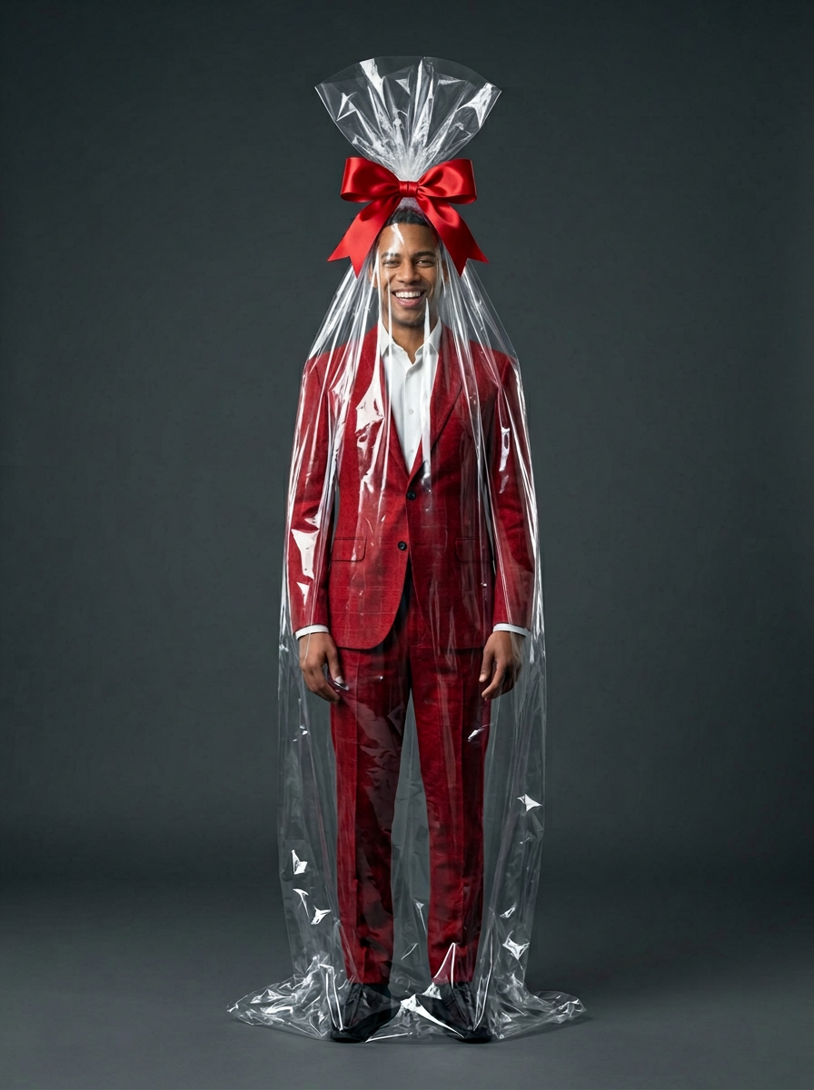 {"frame": {"aspect_ratio": "3:4", "shot_size": "Full Shot (FS)", "orientation": "Portrait", "composition_guide": "Center Framed"}, "subject": {"subject_type": "Human", "identity_summary": "Same person as the input photo; keep age, gender expression, face, skin tone, and hair identical.", "visual_signature": {"facial_signature": {"face_shape": "Match reference exactly", "eye_details": "Match reference exactly", "nose_details": "Match reference exactly", "lip_details": "Match reference exactly", "cheek_and_jaw": "Match reference exactly", "unique_features": "Keep all facial details from the reference; do not change identity."}, "body_signature": {"build": "Same body type as reference", "proportions": "Natural, realistic", "skin_tone_and_texture": "Match reference skin tone, hyper-realistic", "height_estimation_cm": 165, "unique_markings": "Copy any markings from reference if ."}}, "pose_and_action": {"description": "Standing upright like a wrapped gift.", "body_position": "Full body, centered, standing straight.", "limb_positions": "Arms relaxed along the sides inside the wrapping.", "hand_gestures": "Natural, relaxed fingers.", "facial_expression": "Calm, neutral or slight smile.", "gaze_direction": "Looking straight at camera."}, "inventory": {"wardrobe": "Christmas-themed red men’s suit: tailored red blazer with light festive details, matching straight-leg trousers. Smooth, premium fabric, no logos or text.", "accessories": "Minimal, elegant jewelry only if it matches the reference style.", "held_objects": "None.", "hair_style": "Same hair as reference, styled neatly and inside the wrapping."}}, "environment": {"setting_type": "Indoor", "location_description": "Professional studio with a clean, seamless backdrop.", "time_of_day": "N/A (studio)", "weather_conditions": "N/A", "background_elements": "Plain deep background, no extra props."}, "lighting": {"global_illumination": "Controlled studio light.", "primary_source": "Softbox above and in front.", "direction": "Mostly frontal with slight angle.", "shadow_quality": "Soft, diffused shadows; subtle reflections on plastic.", "color_temperature": "Neutral daylight."}, "camera": {"angle": "Eye Level", "lens_type": "Standard 50mm", "focal_length_mm": 50, "aperture": "f/4"}, "special_elements": {"wrapping_description": "Subject fully enclosed in tall, shiny, transparent gift cellophane from floor to above the head, with realistic folds and reflections.", "bow_description": "Large satin red gift bow where the plastic gathers above the head, matching the red suit.", "ground_interaction": "Wrapping touches the floor and bunches slightly around the feet."}, "post_processing": {"art_medium": "Photography", "style_modifiers": "Hyper-realistic, high-end fashion, Christmas gift concept", "color_grade": "Deep blacks, rich but natural reds, clear highlights on plastic.", "rendering_engine": "Photorealistic, 8K", "quality_boosters": "Ultra-detailed textures, sharp focus, no noise."}, "negative": {"artifact_suppression": "bad anatomy, extra limbs, extra fingers, warped plastic, text, watermark, logo, glitch, blur, low resolution, bad geometry", "subject_excludes": "cartoon style, 3D render look, changed identity, different clothing colors, Santa hat costume, outdoor setting, busy background, extra people, cropped body"}}}