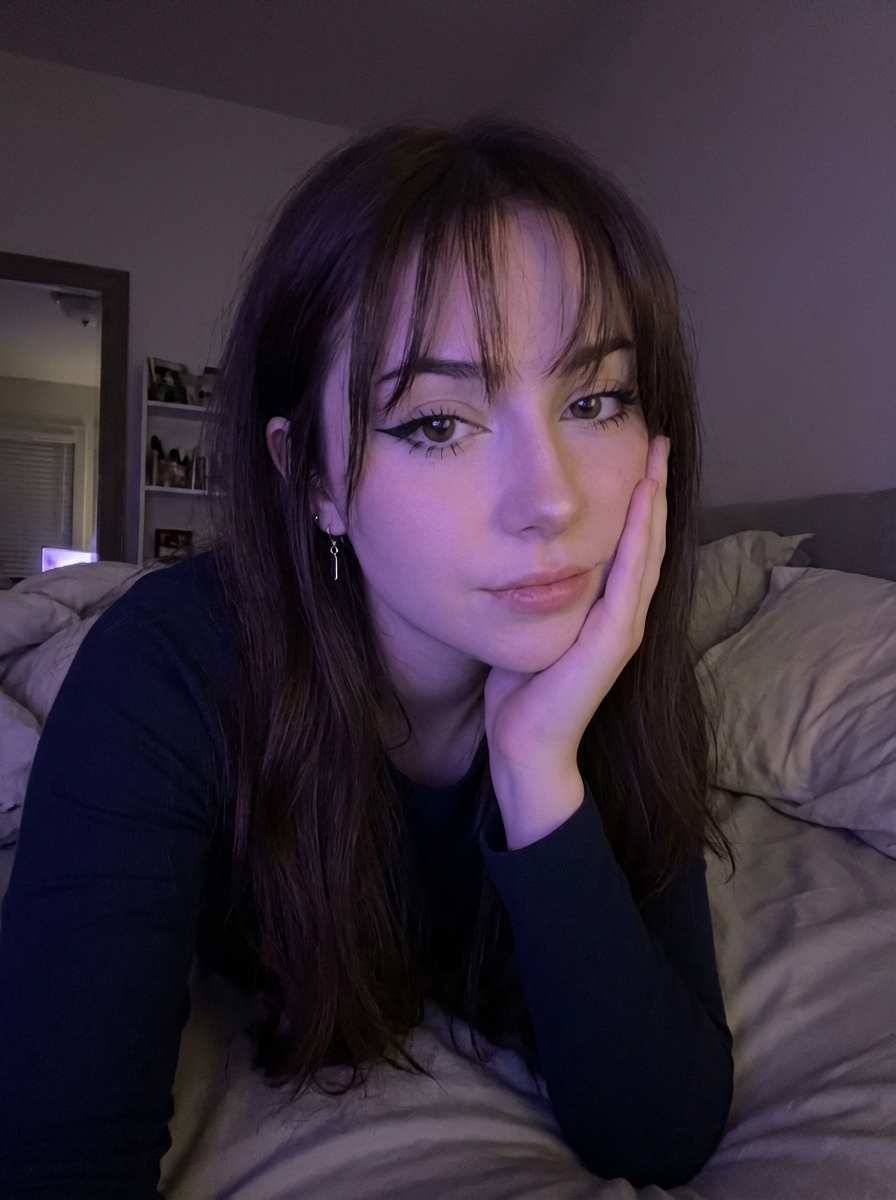 {"frame": {"aspect_ratio": "3:4", "shot_size": "Medium Close-Up (MCU)", "orientation": "Portrait", "composition_guide": "Center Framed"}, "subject": {"subject_type": "Human", "identity_summary": "Young adult model with, long dark hair, and soft delicate features.", "visual_signature": {"facial_signature": {"face_shape": "Soft oval with a tapered chin", "eye_details": "Large, dark irises, prominent winged eyeliner (cat-eye), defined lower lashes, purple-tinted catchlights", "nose_details": "Small, narrow bridge with a button tip", "lip_details": "Soft pink, rosebud shape, slightly plump, natural finish", "cheek_and_jaw": "Smooth soft jawline, lack of harsh contours, ", "unique_features": "Wispy see-through bangs heavily framing the forehead"}, "body_signature": {"build": "Slender/Petite frame", "proportions": "Narrow shoulders", "skin_tone_and_texture": "Fair/ with cool undertones (influenced by lighting)", "height_estimation_cm": 165, "unique_markings": "None visible"}}, "pose_and_action": {"description": "Subject is seated, leaning slightly forward in a relaxed selfie pose.", "body_position": "Torso facing forward, shoulders slightly uneven due to arm position.", "limb_positions": "Right arm raised, elbow resting on an unseen surface; Left arm obscured/down.", "hand_gestures": "Right hand gently cupping the right cheek, fingers relaxed and slightly curled, palm facing inward.", "facial_expression": "Soft neutral, relaxed mouth, subtle allure.", "gaze_direction": "Direct at camera (lens interaction)"}, "inventory": {"wardrobe": "Dark brown or long-sleeved top with a scoop neckline.", "accessories": "Small metallic if(gender=f){drop earring } visible on the left ear.", "held_objects": "None visible (phone implied to be holding camera).", "hair_style": "Long, dark brown/straight hair extending past shoulders, layered with wispy bangs."}}, "environment": {"setting_type": "Indoor", "location_description": "Dimly lit bedroom or private room.", "time_of_day": "Night / Artificial Light", "weather_conditions": "N/A (Indoor)", "background_elements": "Blurred domestic clutter: unmade bedding/pillows on the right, partial view of a mirror and shelf on the left."}, "lighting": {"global_illumination": "Cinematic Low-Key", "primary_source": "Screen Glow or LED Strip (Purple/Violet cast)", "direction": "Front-lit (soft glow)", "shadow_quality": "Diffused, soft fall-off", "color_temperature": "Cool (Purple/Blue dominant)"}, "camera": {"angle": "Eye-Level", "lens_type": "24mm Smartphone Wide Angle (Simulated)", "focal_length_mm": 24, "aperture": "f/1.8 (Shallow Depth of Field)"}, "post_processing": {"art_medium": "Photography", "style_modifiers": "Selfie Aesthetic, Soft Focus, Mood Lighting, K-Pop Aesthetic", "color_grade": "Violet and Magenta tint, Cool Shadows, Desaturated Skin", "rendering_engine": "Photorealism", "quality_boosters": "High fidelity, sharp eyes, noise reduction, 4k"}, "negative": {"artifact_suppression": "bad anatomy, extra fingers, missing fingers, distorted hand, bad eyes, text, watermark, noise, grain", "subject_excludes": "smiling, open mouth, bright daylight, warm lighting, yellow tones, hair, short hair, different person, male"}}