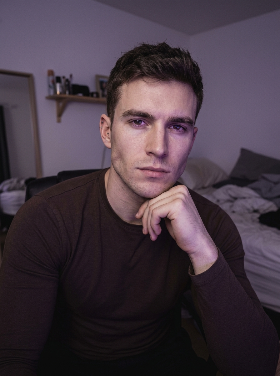 {"frame": {"aspect_ratio": "3:4", "shot_size": "Medium Close-Up (MCU)", "orientation": "Portrait", "composition_guide": "Center Framed"}, "subject": {"subject_type": "Human", "identity_summary": "Young adult male model with short dark hair and chiseled features.", "visual_signature": {"facial_signature": {"face_shape": "Defined oval with strong jawline", "eye_details": "Large, dark irises, thick natural brows, purple-tinted catchlights", "nose_details": "Straight, proportionate bridge", "lip_details": "Neutral shape, natural finish", "cheek_and_jaw": "Defined cheekbones, strong jawline with light stubble", "unique_features": "Short textured fringe framing the forehead"}, "body_signature": {"build": "Lean athletic frame", "proportions": "Broad shoulders", "skin_tone_and_texture": "Fair with cool undertones (influenced by lighting)", "height_estimation_cm": 180, "unique_markings": "None "}}, "pose_and_action": {"description": "Subject is seated, leaning slightly forward in a confident selfie pose.", "body_position": " facing forward, shoulders slightly uneven due to arm position.", "limb_positions": "Right arm raised, elbow resting on an unseen surface; Left arm obscured/down.", "hand_gestures": "Right hand resting on the jawline, fingers relaxed and slightly curled, palm facing inward.", "facial_expression": "Calm neutral, relaxed mouth, subtle intensity.", "gaze_direction": "Direct at camera (lens interaction)"}, "inventory": {"wardrobe": "Dark brown long-sleeved fitted shirt with crew neckline.", "accessories": "Small metallic studs on the left ear.", "held_objects": "None (phone implied to be holding camera).", "hair_style": "Short, dark brown textured hair, layered with fringe."}}, "environment": {"setting_type": "Indoor", "location_description": "Dimly lit bedroom or private room.", "time_of_day": "Night / Artificial Light", "weather_conditions": "N/A (Indoor)", "background_elements": "Blurred domestic clutter: unmade bedding/pillows on the right, partial view of a mirror and shelf on the left."}, "lighting": {"global_illumination": "Cinematic Low-Key", "primary_source": "Screen Glow or LED Strip (Purple/Violet cast)", "direction": "Front-lit (soft glow)", "shadow_quality": "Diffused, soft fall-off", "color_temperature": "Cool (Purple/Blue dominant)"}, "camera": {"angle": "Eye-Level", "lens_type": "24mm Smartphone Wide Angle (Simulated)", "focal_length_mm": 24, "aperture": "f/1.8 (Shallow Depth of Field)"}, "post_processing": {"art_medium": "Photography", "style_modifiers": "Selfie Aesthetic, Soft Focus, Mood Lighting, K-Pop Aesthetic", "color_grade": "Violet and Magenta tint, Cool Shadows, Desaturated Skin", "rendering_engine": "Photorealism", "quality_boosters": "High fidelity, sharp eyes, noise reduction, 4k"}, "negative": {"artifact_suppression": "bad anatomy, extra fingers, missing fingers, distorted hand, bad eyes, text, watermark, noise, grain", "subject_excludes": "smiling, open mouth, bright daylight, warm lighting, yellow tones, long hair, different person, female"}}}