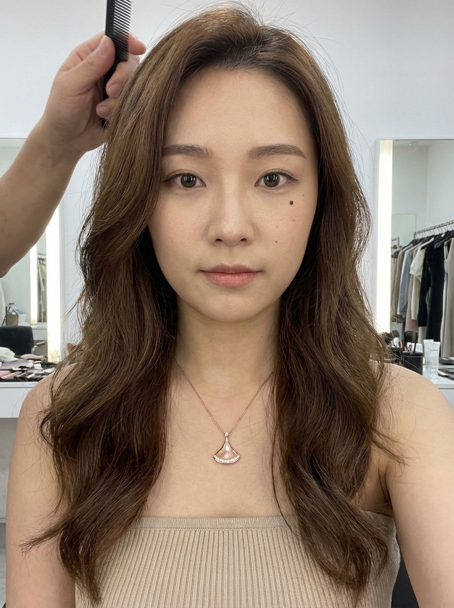 {"frame": {"aspect_ratio": "4:5", "shot_size": "Close-Up (CU)", "orientation": "Portrait", "composition_guide": "Center Framed"}, "subject": {"subject_type": "Human", "identity_summary": "Young East model with long wavy brown hair, and a distinct beauty mark on her right cheek.", "visual_signature": {"facial_signature": {"face_shape": "Soft oval with a tapered, V-line jaw", "eye_details": "Large, almond-shaped, dark brown irises, defined double eyelids, long curled lashes, soft aegyo-sal", "nose_details": "Small, straight bridge with a refined, narrow tip", "lip_details": "Plump, glossy, gradient pink-coral tint, slightly parted", "cheek_and_jaw": "Smooth fair cheeks; a distinct small dark beauty mark on the subject's right cheek (viewer's left) just below eye level", "unique_features": "Beauty mark on right cheek; with natural micro-texture (not airbrushed)"}, "body_signature": {"build": "Slender, petite frame", "proportions": "Narrow shoulders, prominent collarbones", "skin_tone_and_texture": "Fair to very with natural, high-frequency texture: visible pores (nose/inner cheeks), subtle peach fuzz, micro-freckles across nose/upper cheeks, mild natural redness on cheeks, slightly dewy highlight on cheekbones/bridge of nose, soft under-eye texture with fine creasing; overall healthy skin with realistic specular breakup (not plastic/waxy, not heavily airbrushed).", "height_estimation_cm": 165, "unique_markings": "None visible on body"}}, "pose_and_action": {"description": "The subject is looking directly at the camera while having her hair styled by an off-screen person.", "body_position": "Torso facing forward, shoulders slightly angled", "limb_positions": "Arms down at sides (not visible)", "hand_gestures": "Not visible", "facial_expression": "Neutral to soft smile, calm and attentive", "gaze_direction": "Direct at camera"}, "inventory": {"wardrobe": "strapless top with vertical ribbed texture and a curved neckline", "accessories": "Rose gold necklace with a fan-shaped pendant (resembling Bulgari Divas' Dream), small open-heart shaped earring on subject's right ear", "held_objects": "None by subject; a comb/styling tool handle is visible at the top left, held by an unseen stylist", "hair_style": "Long, voluminous, wavy brown hair with lighter chestnut highlights, parted to the side"}, "skin_detailing": {"finish": "natural satin-dewy (not oily), realistic specular highlights with breakup", "micro_detail": "pores visible on nose and inner cheeks, subtle peach fuzz, micro-freckles, faint natural skin grain, soft under-eye texture", "makeup_interaction": "foundation sits naturally on skin with slight texture; blush softly diffused; no heavy smoothing; no beauty-filter look", "imperfections_allowed": "tiny blemish-level variance, mild redness, subtle tonal variation for realism"}}, "environment": {"setting_type": "Indoor", "location_description": "Brightly lit interior, likely a dressing room or backstage makeup area", "time_of_day": "Artificial Light", "weather_conditions": "Indoor controlled", "background_elements": "Blurred walls, a hint of a doorframe or mirror edge in the upper left"}, "lighting": {"global_illumination": "Soft, diffuse beauty lighting with preserved micro-contrast for skin texture", "primary_source": "Front-facing softbox or ring light", "direction": "Frontal", "shadow_quality": "Minimal, very soft shadows under the jaw", "color_temperature": "Neutral white (approx 5000k)"}, "camera": {"angle": "Eye-Level", "lens_type": "85mm Portrait", "focal_length_mm": 85, "aperture": "f/2.8 (Moderate Depth of Field)"}, "post_processing": {"art_medium": "Photography", "style_modifiers": "high-fidelity beauty close-up, K-pop-inspired glamour aesthetic, natural skin realism, minimal editorial retouch", "color_grade": "Soft pastels, slightly desaturated backgrounds, natural warm skin with realistic redness", "rendering_engine": "Photorealistic", "quality_boosters": "8k, tack-sharp focus on eyes, high micro-contrast for skin grain, realistic subsurface scattering, physically-based specular response, minimal skin smoothing, no aggressive denoising, crisp but not over-sharpened"}, "negative": {"artifact_suppression": "bad anatomy, blurry, noise, text, watermark, distortion, low quality, waxy skin, plastic skin, over-smoothed face, poreless skin, heavy beauty filter, muddy texture, AI skin blotches, over-sharpened halos", "subject_excludes": "different person, missing beauty mark, wrong jewelry, hair covering face, male subject"}}