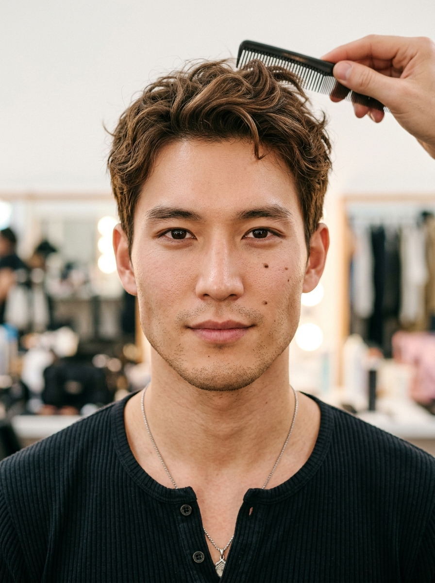 {"frame": {"aspect_ratio": "4:5", "shot_size": "Close-Up (CU)", "orientation": "Portrait", "composition_guide": "Center Framed"}, "subject": {"subject_type": "Human", "identity_summary": "Young East Asian model with short textured brown hair, and a distinct beauty mark on his right cheek.", "visual_signature": {"facial_signature": {"face_shape": "Angular oval with a strong, squared jaw", "eye_details": "Almond-shaped, dark brown irises, defined eyelids, short straight lashes, subtle under-eye structure", "nose_details": "Straight bridge with a refined, narrow tip", "lip_details": "Firm, natural color, slightly parted", "cheek_and_jaw": "Smooth fair cheeks with light stubble; a distinct small dark beauty mark on the subject's right cheek (viewer's left) just below eye level", "unique_features": "Beauty mark on right cheek; with natural micro-texture (not airbrushed)"}, "body_signature": {"build": "Lean, athletic frame", "proportions": "Broad shoulders, prominent collarbones", "skin_tone_and_texture": "Fair to very light with natural, high-frequency texture: pores (nose/inner cheeks), subtle peach fuzz, micro-freckles across nose/upper cheeks, mild natural redness on cheeks, slightly dewy highlight on cheekbones/bridge of nose, soft under-eye texture with fine creasing, light stubble on jawline; overall healthy skin with realistic specular breakup (not plastic/waxy, not heavily airbrushed).", "height_estimation_cm": 180, "unique_markings": "None on body"}}, "pose_and_action": {"description": "The subject is looking directly at the camera while having his hair styled by an off-screen person.", "body_position": " facing forward, shoulders slightly angled", "limb_positions": "Arms down at sides (not )", "hand_gestures": "Not ", "facial_expression": "Neutral to subtle smile, calm and attentive", "gaze_direction": "Direct at camera"}, "inventory": {"wardrobe": "fitted henley shirt with vertical ribbed texture and a curved neckline", "accessories": "Silver chain necklace with a simple geometric pendant, none on ears", "held_objects": "None by subject; a comb/styling tool handle is at the top left, held by an unseen stylist", "hair_style": "Short, textured, wavy brown hair with lighter chestnut highlights, tousled to the side"}, "skin_detailing": {"finish": "natural satin-dewy (not oily), realistic specular highlights with breakup", "micro_detail": "pores on nose and inner cheeks, subtle peach fuzz, micro-freckles, faint natural skin grain, soft under-eye texture, light stubble", "makeup_interaction": "natural features sit naturally on skin with slight texture; natural flush softly diffused; no heavy smoothing; no beauty-filter look", "imperfections_allowed": "tiny blemish-level variance, mild redness, subtle tonal variation for realism"}}, "environment": {"setting_type": "Indoor", "location_description": "Brightly lit interior, likely a dressing room or backstage makeup area", "time_of_day": "Artificial Light", "weather_conditions": "Indoor controlled", "background_elements": "Blurred walls, a hint of a doorframe or mirror edge in the upper left"}, "lighting": {"global_illumination": "Soft, diffuse beauty lighting with preserved micro-contrast for skin texture", "primary_source": "Front-facing softbox or ring light", "direction": "Frontal", "shadow_quality": "Minimal, very soft shadows under the jaw", "color_temperature": "Neutral white (approx 5000k)"}, "camera": {"angle": "Eye-Level", "lens_type": "85mm Portrait", "focal_length_mm": 85, "aperture": "f/2.8 (Moderate Depth of Field)"}, "post_processing": {"art_medium": "Photography", "style_modifiers": "high-fidelity beauty close-up, K-pop-inspired glamour aesthetic, natural skin realism, minimal editorial retouch", "color_grade": "Soft pastels, slightly desaturated backgrounds, natural warm skin with realistic redness", "rendering_engine": "Photorealistic", "quality_boosters": "8k, tack-sharp focus on eyes, high micro-contrast for skin grain, realistic subsurface scattering, physically-based specular response, minimal skin smoothing, no aggressive denoising, crisp but not over-sharpened"}, "negative": {"artifact_suppression": "bad anatomy, blurry, noise, text, watermark, distortion, low quality, waxy skin, plastic skin, over-smoothed face, poreless skin, heavy beauty filter, muddy texture, AI skin blotches, over-sharpened halos", "subject_excludes": "different person, missing beauty mark, wrong jewelry, hair covering face, female subject"}}}