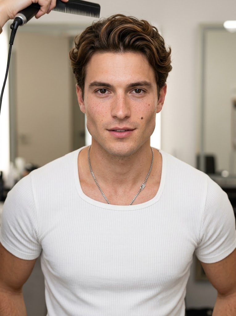 {"frame": {"aspect_ratio": "4:5", "shot_size": "Close-Up (CU)", "orientation": "Portrait", "composition_guide": "Center Framed"}, "subject": {"subject_type": "Human", "identity_summary": "Young East Asian male model with short wavy brown hair, and a distinct beauty mark on his right cheek.", "visual_signature": {"facial_signature": {"face_shape": "Defined oval with a strong, angular jawline", "eye_details": "Almond-shaped, dark brown irises, defined eyelids, short straight lashes", "nose_details": "Small, straight bridge with a refined, narrow tip", "lip_details": "Full, natural matte lips, slightly parted", "cheek_and_jaw": "Smooth fair cheeks with light stubble; a distinct small dark beauty mark on the subject's right cheek (viewer's left) just below eye level", "unique_features": "Beauty mark on right cheek; with natural micro-texture (not airbrushed)"}, "body_signature": {"build": "Lean, athletic frame", "proportions": "Broad shoulders, defined collarbones", "skin_tone_and_texture": "Fair to very light with natural, high-frequency texture: pores (nose/inner cheeks), subtle peach fuzz, micro-freckles across nose/upper cheeks, mild natural redness on cheeks, slightly dewy highlight on cheekbones/bridge of nose, soft under-eye texture with fine creasing; overall healthy skin with realistic specular breakup (not plastic/waxy, not heavily airbrushed).", "height_estimation_cm": 180, "unique_markings": "None on body"}}, "pose_and_action": {"description": "The subject is looking directly at the camera while having his hair styled by an off-screen person.", "body_position": " facing forward, shoulders slightly angled", "limb_positions": "Arms down at sides (not )", "hand_gestures": "Not ", "facial_expression": "Neutral to confident smile, calm and attentive", "gaze_direction": "Direct at camera"}, "inventory": {"wardrobe": "fitted crew-neck t-shirt with vertical ribbed texture and a straight neckline", "accessories": "Silver chain necklace with a geometric pendant, none on ears", "held_objects": "None by subject; a comb/styling tool handle is at the top left, held by an unseen stylist", "hair_style": "Short, voluminous, wavy brown hair with lighter chestnut highlights, parted to the side"}, "skin_detailing": {"finish": "natural satin-dewy (not oily), realistic specular highlights with breakup", "micro_detail": "pores on nose and inner cheeks, subtle peach fuzz, micro-freckles, faint natural skin grain, soft under-eye texture", "makeup_interaction": "natural features sits naturally on skin with slight texture; natural features softly diffused; no heavy smoothing; no beauty-filter look", "imperfections_allowed": "tiny blemish-level variance, mild redness, subtle tonal variation for realism"}}, "environment": {"setting_type": "Indoor", "location_description": "Brightly lit interior, likely a dressing room or backstage makeup area", "time_of_day": "Artificial Light", "weather_conditions": "Indoor controlled", "background_elements": "Blurred walls, a hint of a doorframe or mirror edge in the upper left"}, "lighting": {"global_illumination": "Soft, diffuse beauty lighting with preserved micro-contrast for skin texture", "primary_source": "Front-facing softbox or ring light", "direction": "Frontal", "shadow_quality": "Minimal, very soft shadows under the jaw", "color_temperature": "Neutral white (approx 5000k)"}, "camera": {"angle": "Eye-Level", "lens_type": "85mm Portrait", "focal_length_mm": 85, "aperture": "f/2.8 (Moderate Depth of Field)"}, "post_processing": {"art_medium": "Photography", "style_modifiers": "high-fidelity beauty close-up, K-pop-inspired glamour aesthetic, natural skin realism, minimal editorial retouch", "color_grade": "Soft pastels, slightly desaturated backgrounds, natural warm skin with realistic redness", "rendering_engine": "Photorealistic", "quality_boosters": "8k, tack-sharp focus on eyes, high micro-contrast for skin grain, realistic subsurface scattering, physically-based specular response, minimal skin smoothing, no aggressive denoising, crisp but not over-sharpened"}, "negative": {"artifact_suppression": "bad anatomy, blurry, noise, text, watermark, distortion, low quality, waxy skin, plastic skin, over-smoothed face, poreless skin, heavy beauty filter, muddy texture, AI skin blotches, over-sharpened halos", "subject_excludes": "different person, missing beauty mark, wrong jewelry, hair covering face, female subject"}}}