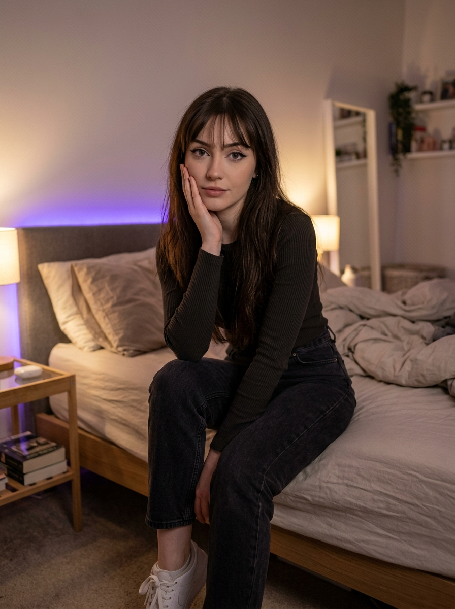 {"frame":{"aspect_ratio":"3:4","shot_size":"Medium Close-Up (MCU)","orientation":"Portrait","composition_guide":"Center Framed"},"subject":{"subject_type":"Human","identity_summary":"Young adult model with, long dark hair, and soft delicate features.","visual_signature":{"facial_signature":{"face_shape":"Soft oval with a tapered chin","eye_details":"Large, dark irises, prominent winged eyeliner (cat-eye), defined lower lashes, purple-tinted catchlights","nose_details":"Small, narrow bridge with a button tip","lip_details":"Soft pink, rosebud shape, slightly plump, natural finish","cheek_and_jaw":"Smooth soft jawline, lack of harsh contours, ","unique_features":"Wispy see-through bangs heavily framing the forehead"},"body_signature":{"build":"Slender\/ frame","proportions":"Narrow shoulders","skin_tone_and_texture":"Fair\/ with cool undertones (influenced by lighting)","height_estimation_cm":165,"unique_markings":"None "}},"pose_and_action":{"description":"Subject is seated, leaning slightly forward in a relaxed selfie pose.","body_position":" facing forward, shoulders slightly uneven due to arm position.","limb_positions":"Right arm raised, elbow resting on an unseen surface; Left arm obscured\/down.","hand_gestures":"Right hand gently cupping the right cheek, fingers relaxed and slightly curled, palm facing inward.","facial_expression":"Soft neutral, relaxed mouth, subtle allure.","gaze_direction":"Direct at camera (lens interaction)"},"inventory":{"wardrobe":"Dark brown or long-sleeved top with a scoop neckline.","accessories":"Small metallic if(gender=f){drop earring } on the left ear.","held_objects":"None (phone implied to be holding camera).","hair_style":"Long, dark brown\/straight hair extending past shoulders, layered with wispy bangs."}},"environment":{"setting_type":"Indoor","location_description":"Dimly lit bedroom or private room.","time_of_day":"Night \/ Artificial Light","weather_conditions":"N\/A (Indoor)","background_elements":"Blurred domestic clutter: unmade bedding\/pillows on the right, partial view of a mirror and shelf on the left."},"lighting":{"global_illumination":"Cinematic Low-Key","primary_source":"Screen Glow or LED Strip (Purple\/Violet cast)","direction":"Front-lit (soft glow)","shadow_quality":"Diffused, soft fall-off","color_temperature":"Cool (Purple\/Blue dominant)"},"camera":{"angle":"Eye-Level","lens_type":"24mm Smartphone Wide Angle (Simulated)","focal_length_mm":24,"aperture":"f\/1.8 (Shallow Depth of Field)"},"post_processing":{"art_medium":"Photography","style_modifiers":"Selfie Aesthetic, Soft Focus, Mood Lighting, K-Pop Aesthetic","color_grade":"Violet and Magenta tint, Cool Shadows, Desaturated Skin","rendering_engine":"Photorealism","quality_boosters":"High fidelity, sharp eyes, noise reduction, 4k"},"negative":{"artifact_suppression":"bad anatomy, extra fingers, missing fingers, distorted hand, bad eyes, text, watermark, noise, grain","subject_excludes":"smiling, open mouth, bright daylight, warm lighting, yellow tones, hair, short hair, different person, male"}}