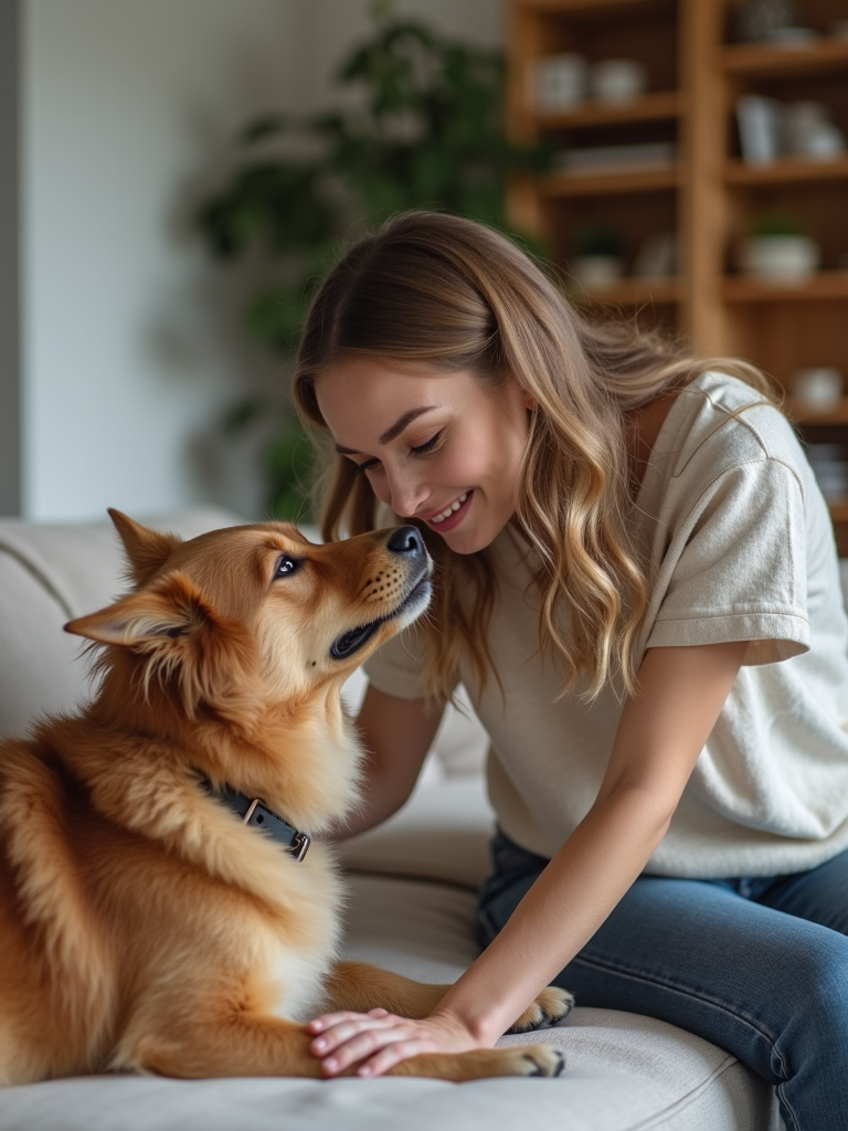 friendly feminine model playing with a dog or cat in a homey living room