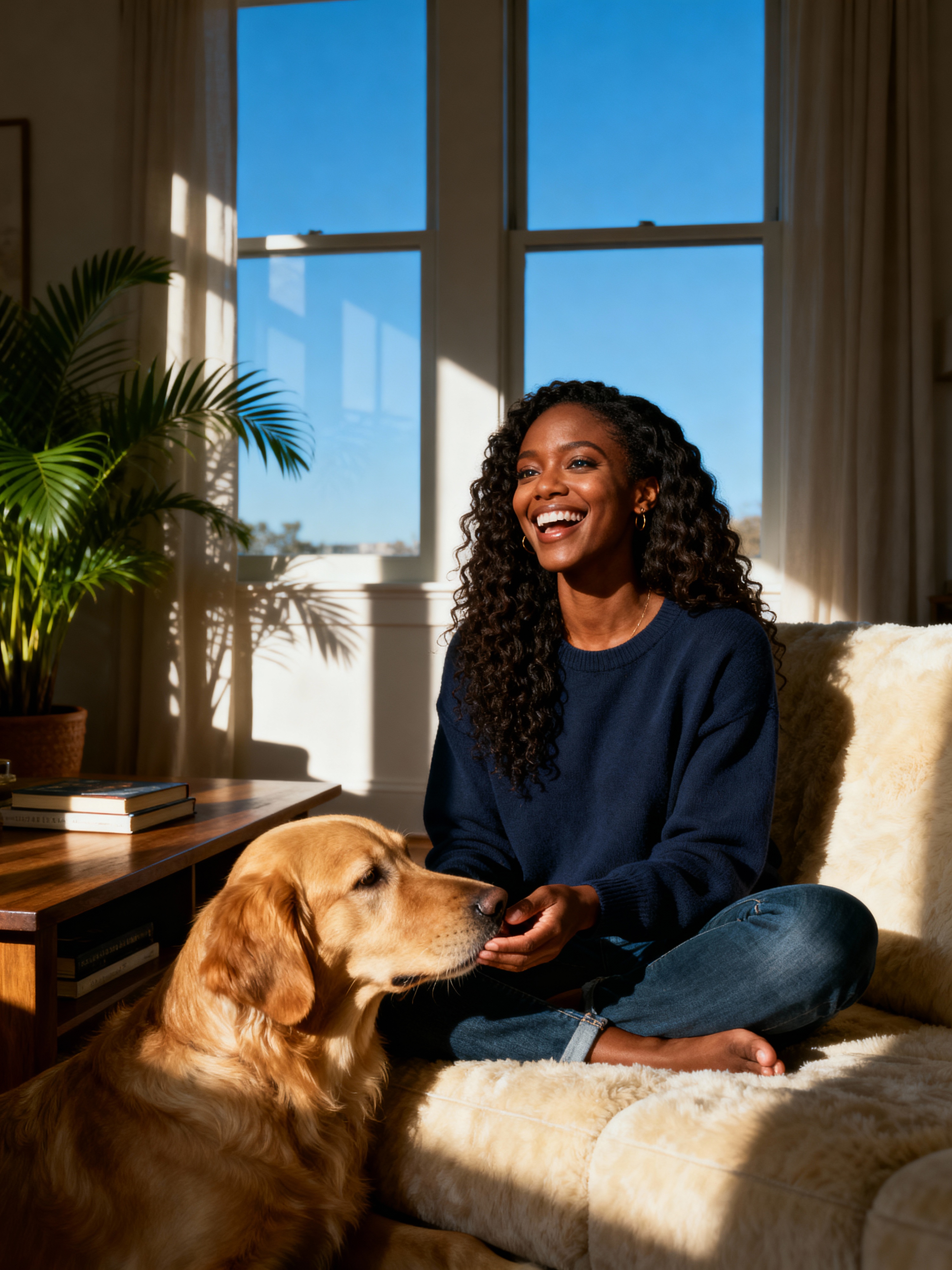 friendly feminine model playing with a dog or cat in a homey living room
