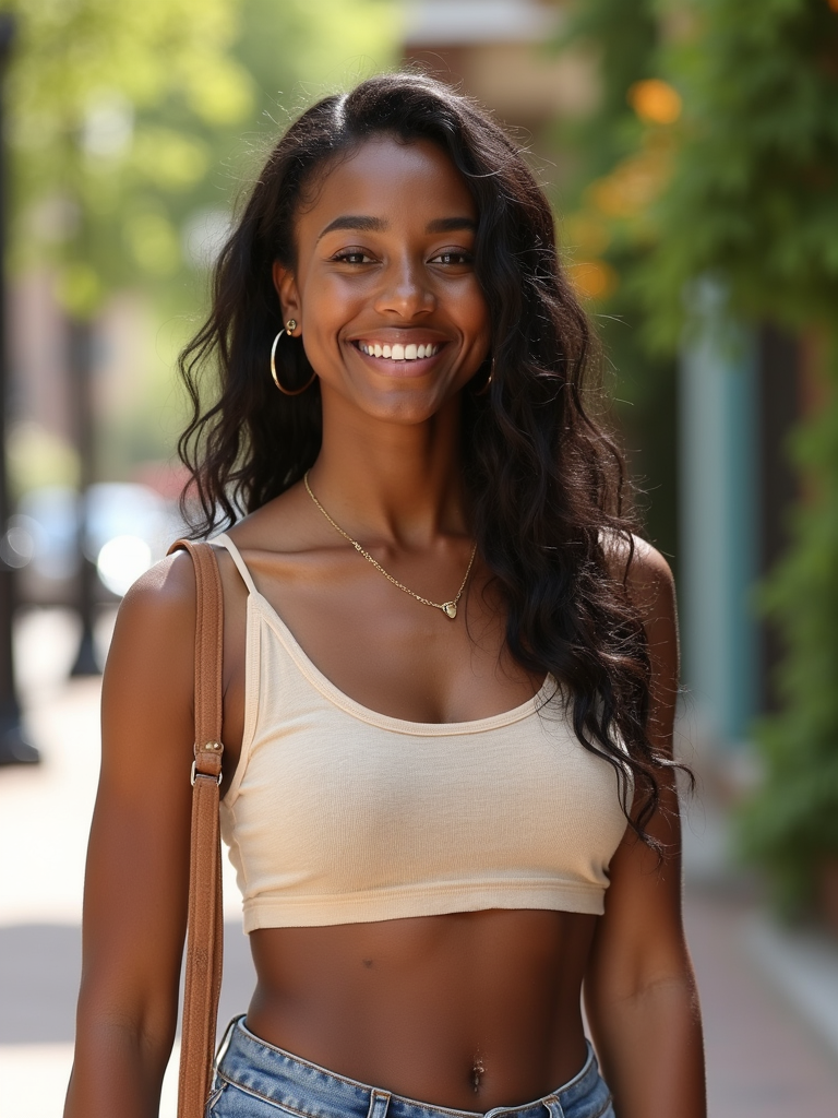 friendly feminine model wearing everyday attire in a bright outdoor setting for a Bumble profile photo