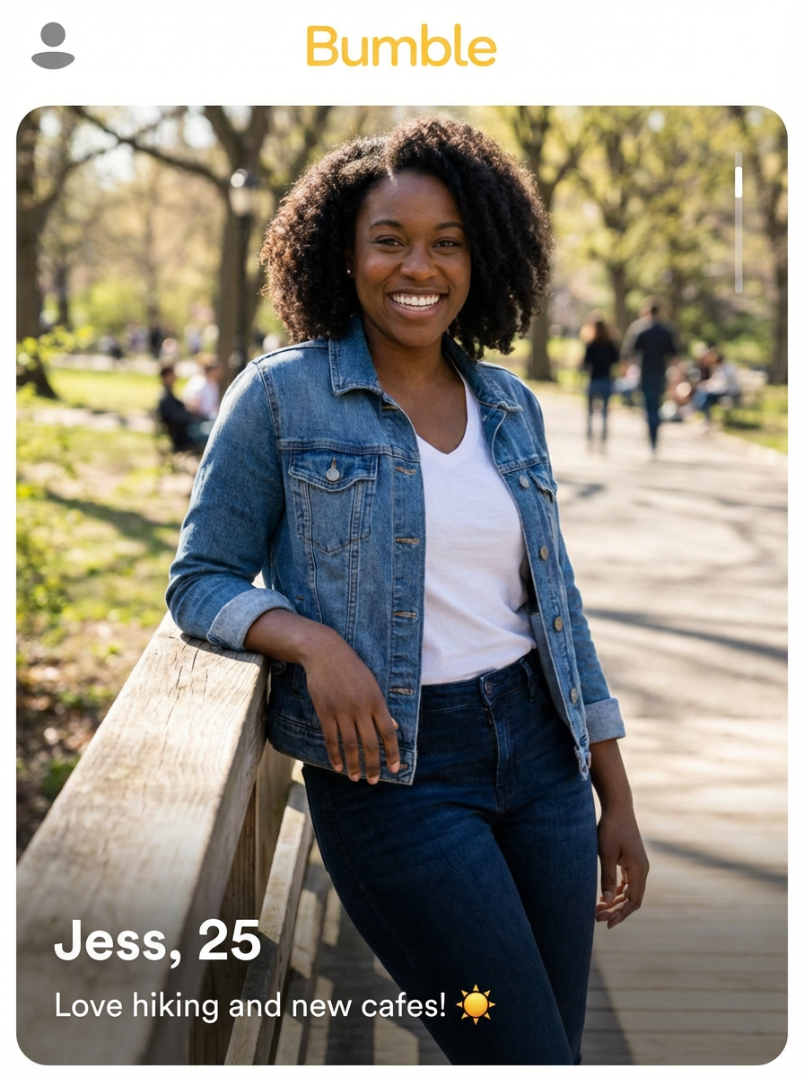 friendly feminine model wearing everyday attire in a bright outdoor setting for a Bumble profile photo