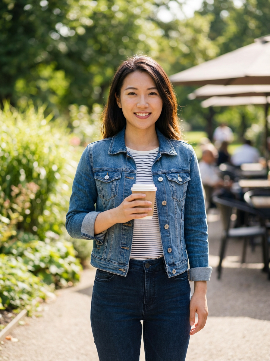 friendly feminine model wearing everyday attire in a bright outdoor setting for a Bumble profile photo