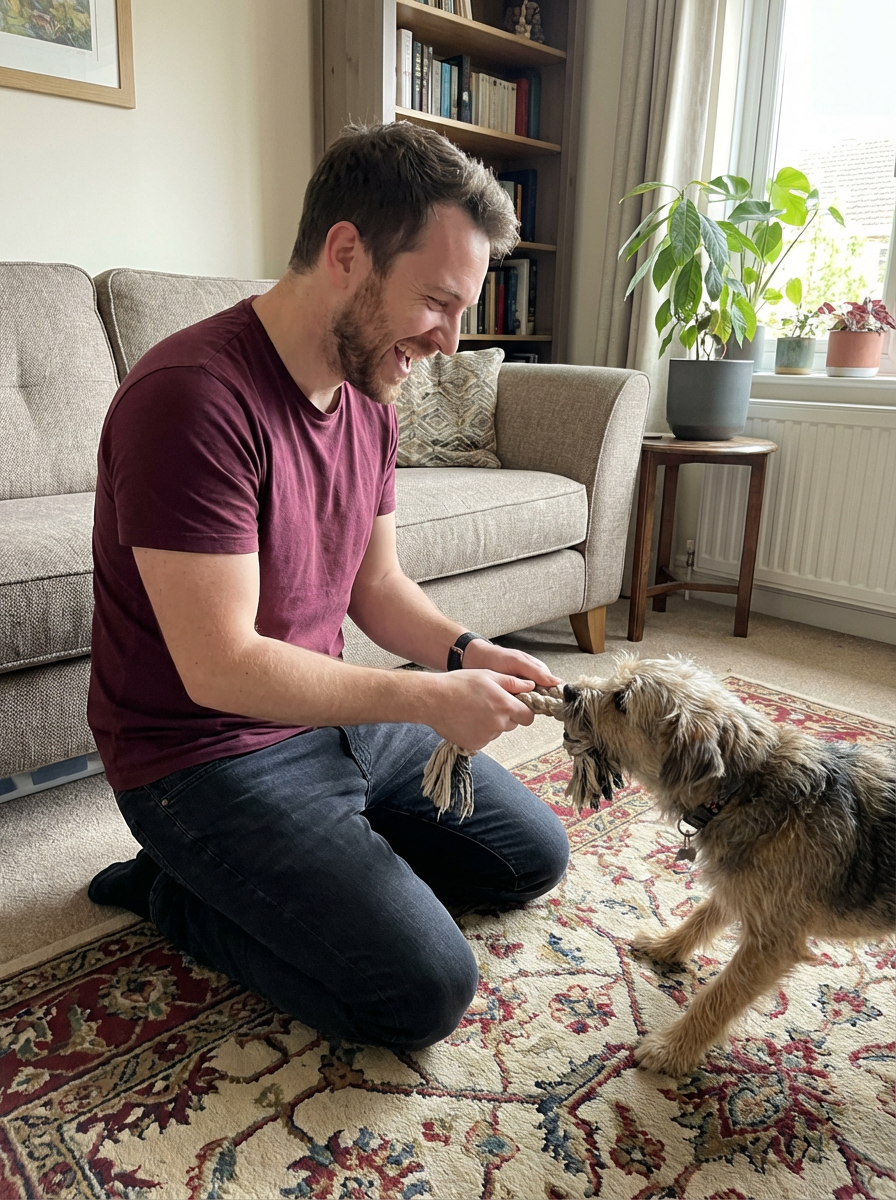friendly masculine model playing with a dog or cat in a homey living room