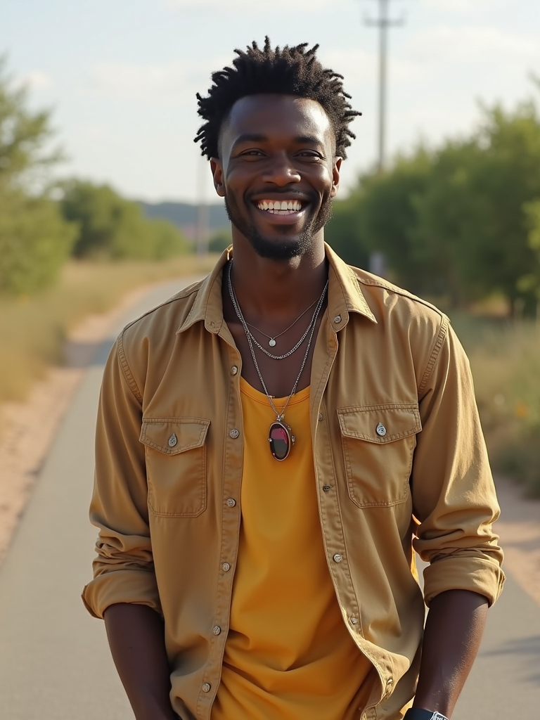 friendly masculine model wearing everyday attire in a bright outdoor setting for a Bumble profile photo