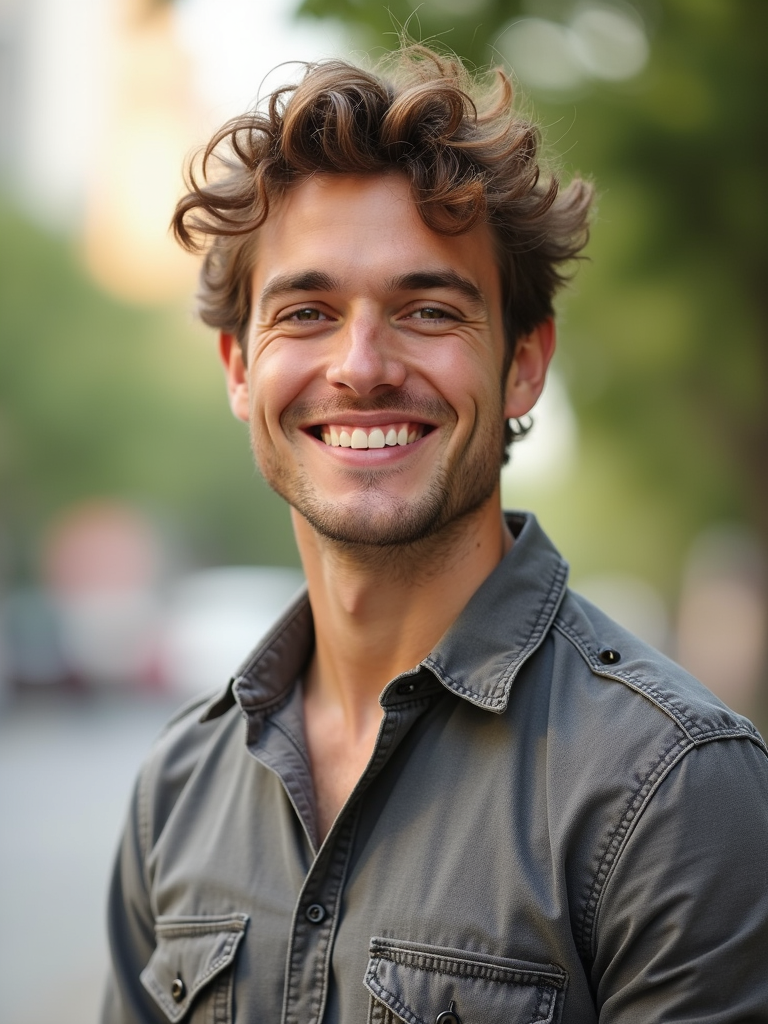 friendly masculine model wearing everyday attire in a bright outdoor setting for a Bumble profile photo