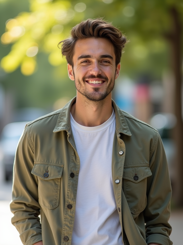 friendly masculine model wearing everyday attire in a bright outdoor setting for a Bumble profile photo