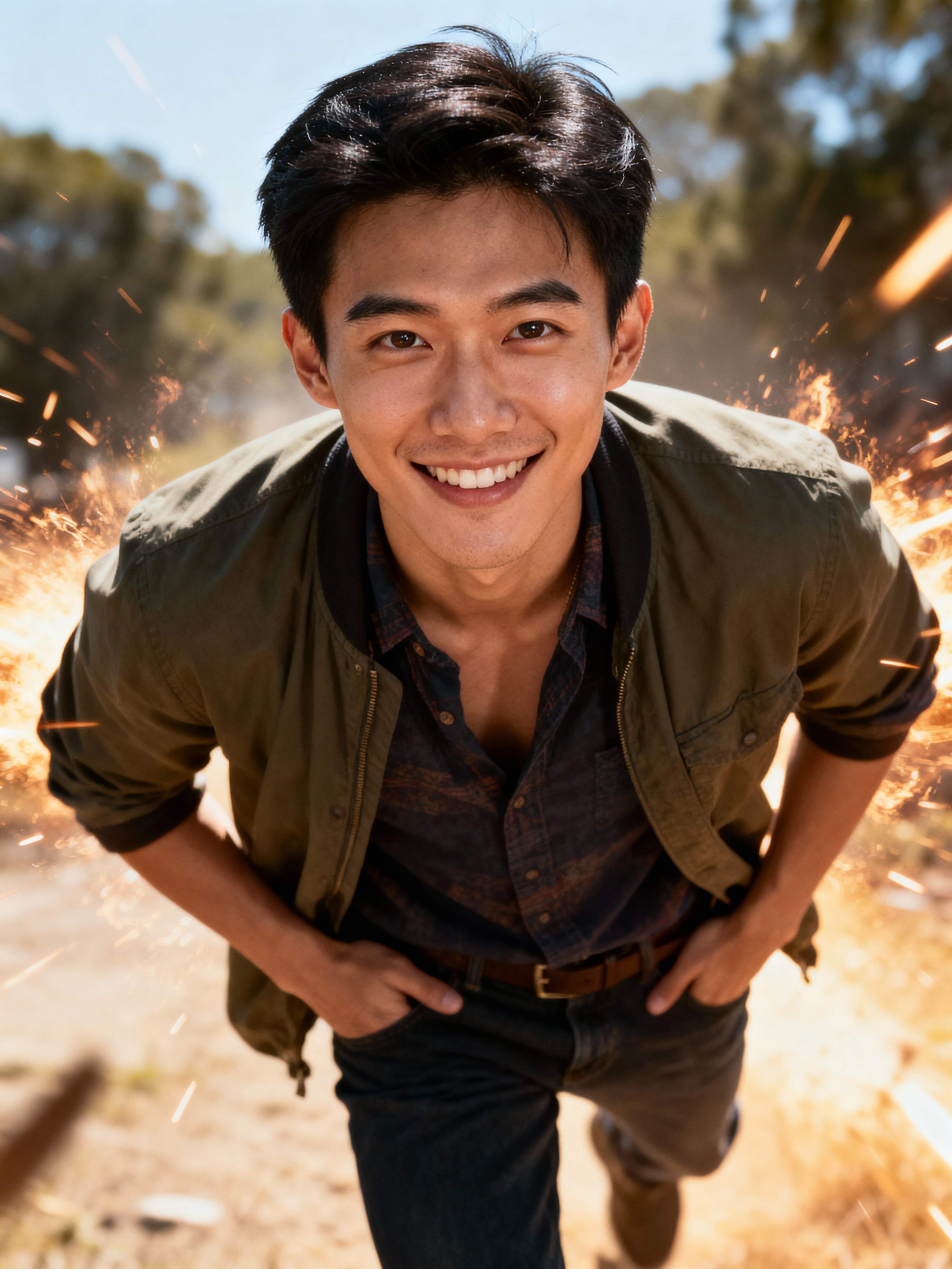 friendly masculine model wearing everyday attire in a bright outdoor setting for a Bumble profile photo