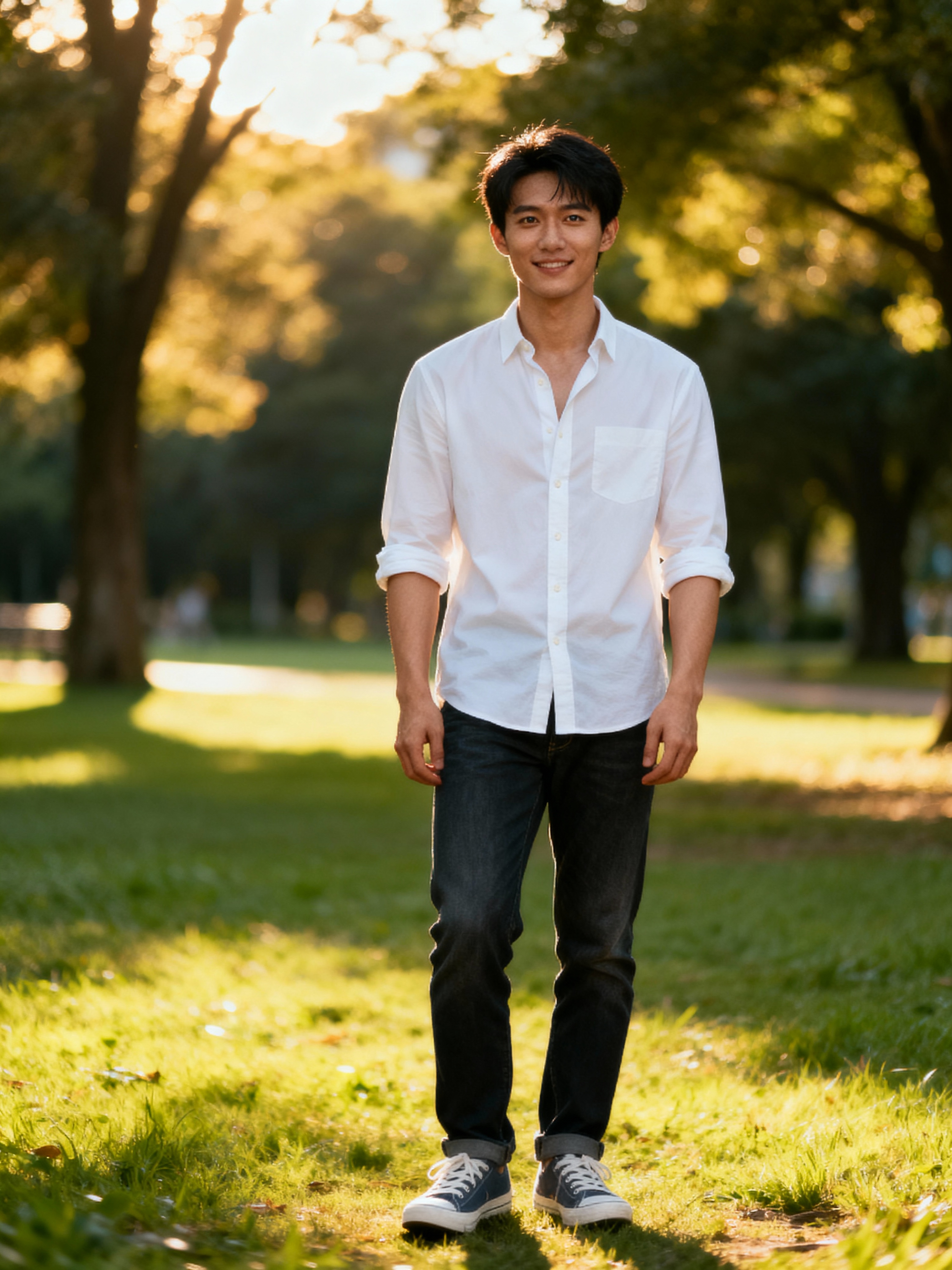 friendly masculine model wearing everyday attire in a bright outdoor setting for a Bumble profile photo