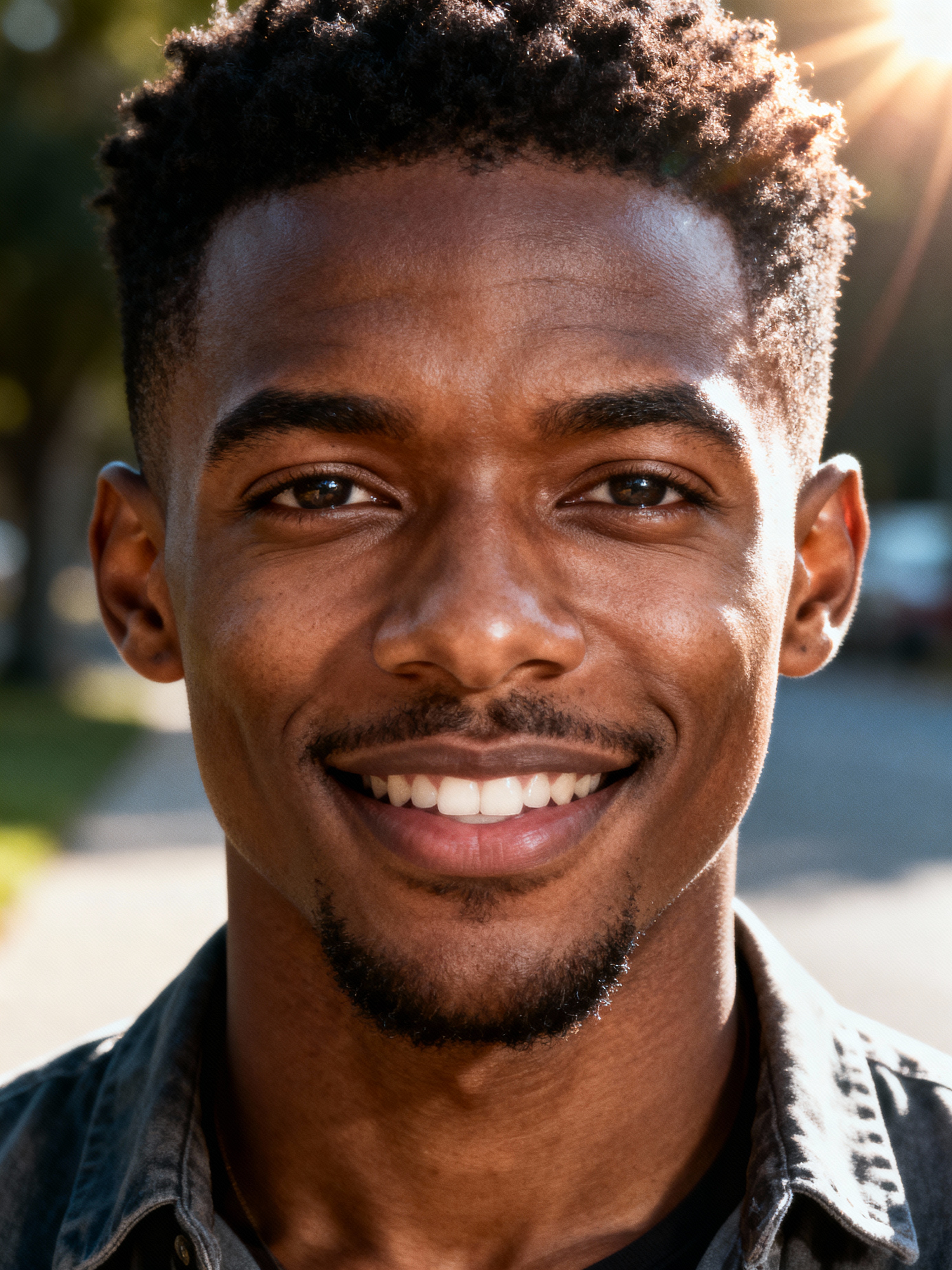 friendly masculine model wearing everyday attire in a bright outdoor setting for a Bumble profile photo
