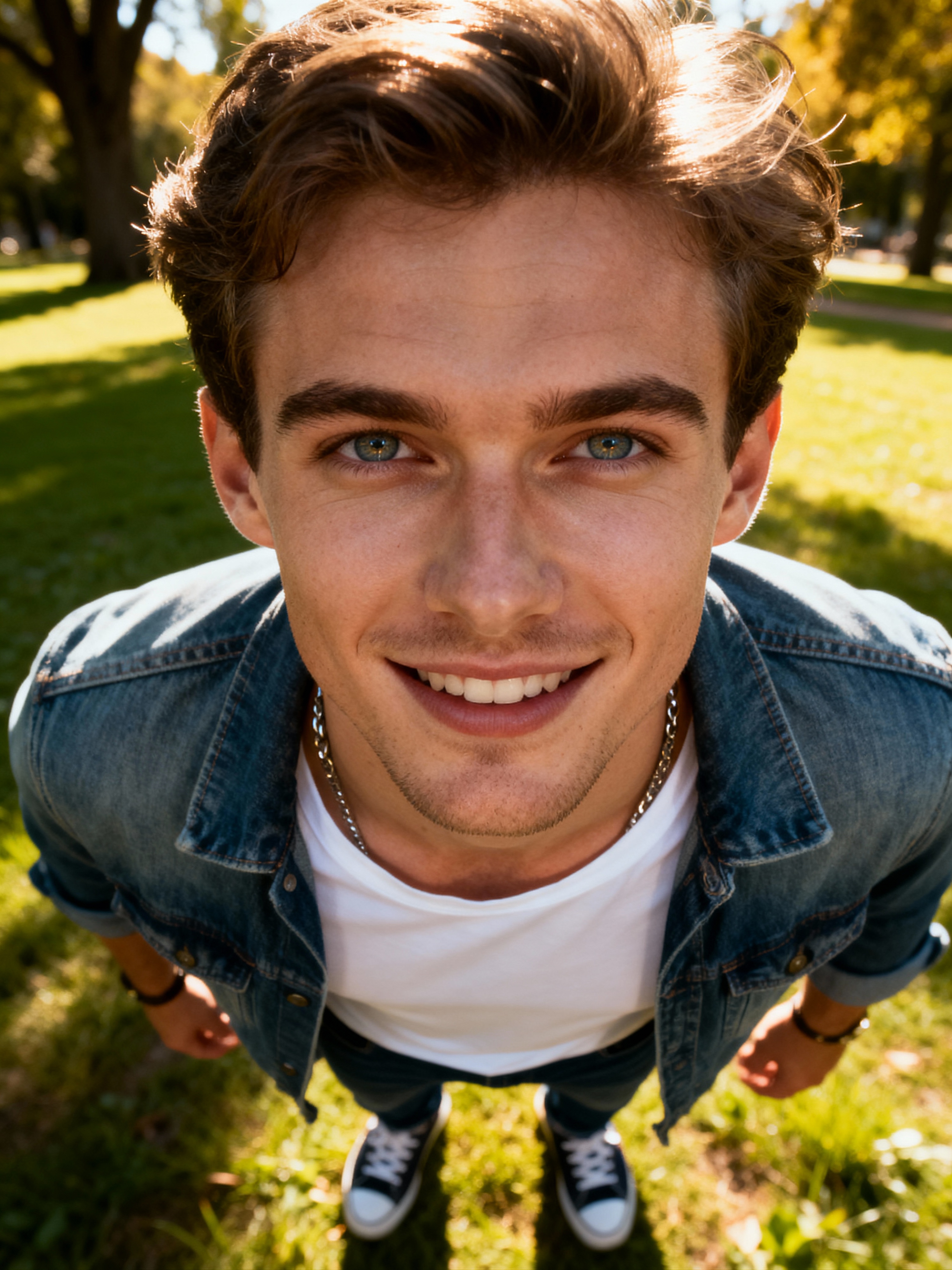 friendly masculine model wearing everyday attire in a bright outdoor setting for a Bumble profile photo