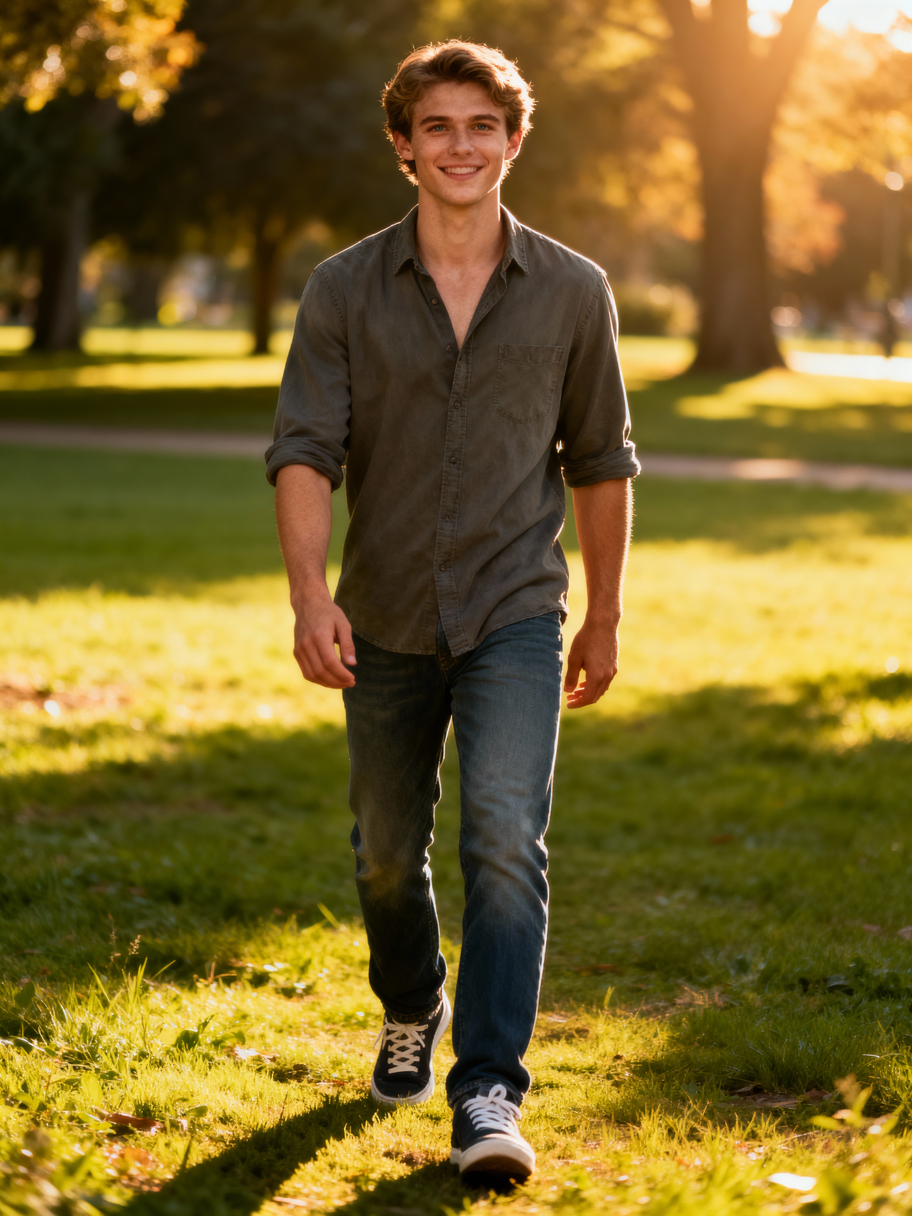 friendly masculine model wearing everyday attire in a bright outdoor setting for a Bumble profile photo