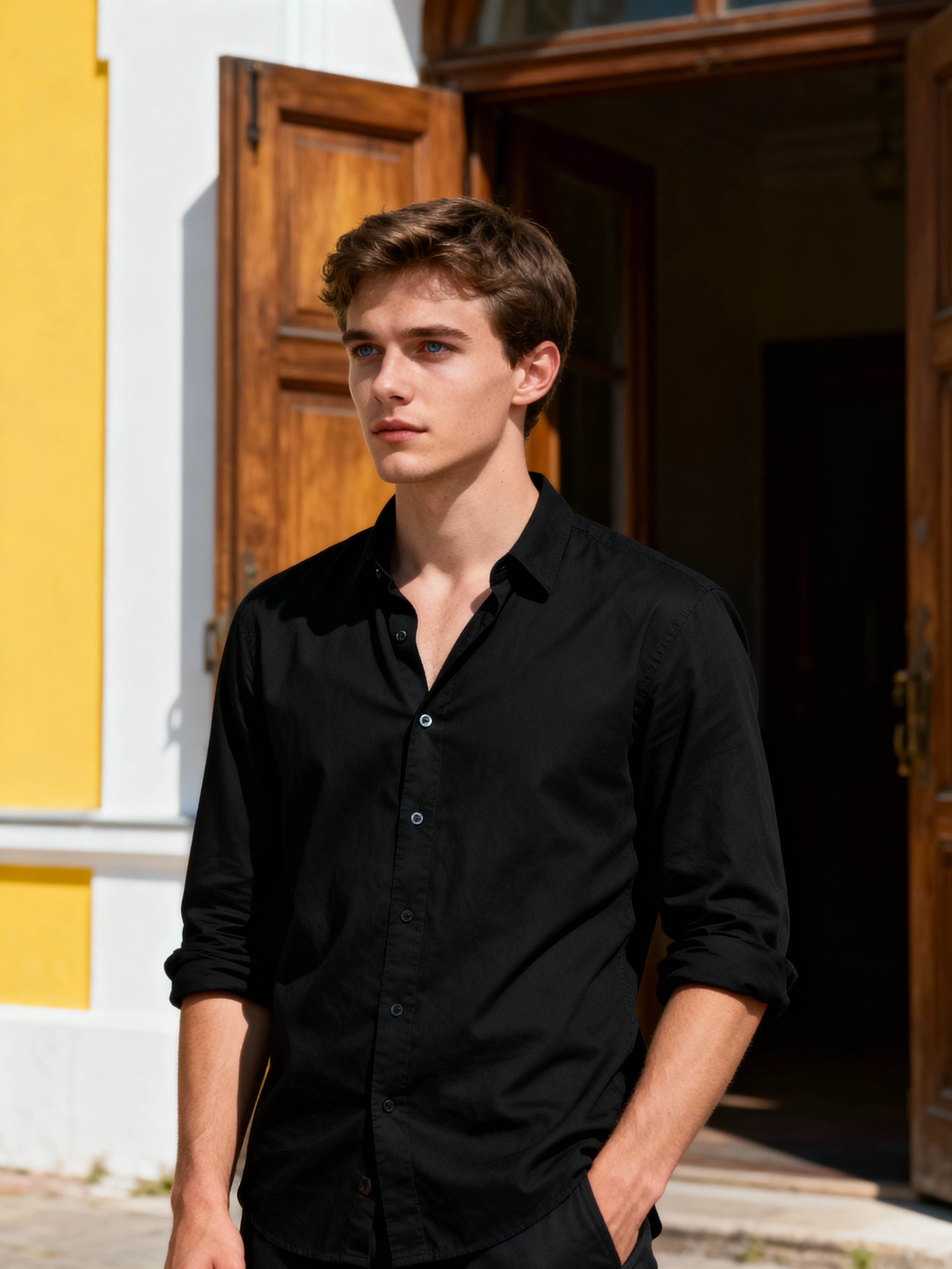 Front view of a model standing outdoors, looking slightly to the left. wearing a black, long-sleeve button-up shirt with the top button undone and the sleeves casually rolled up to the elbows. the left hand is in a pants pocket. in the background, an open wooden door and a yellow and white building facade are visible.