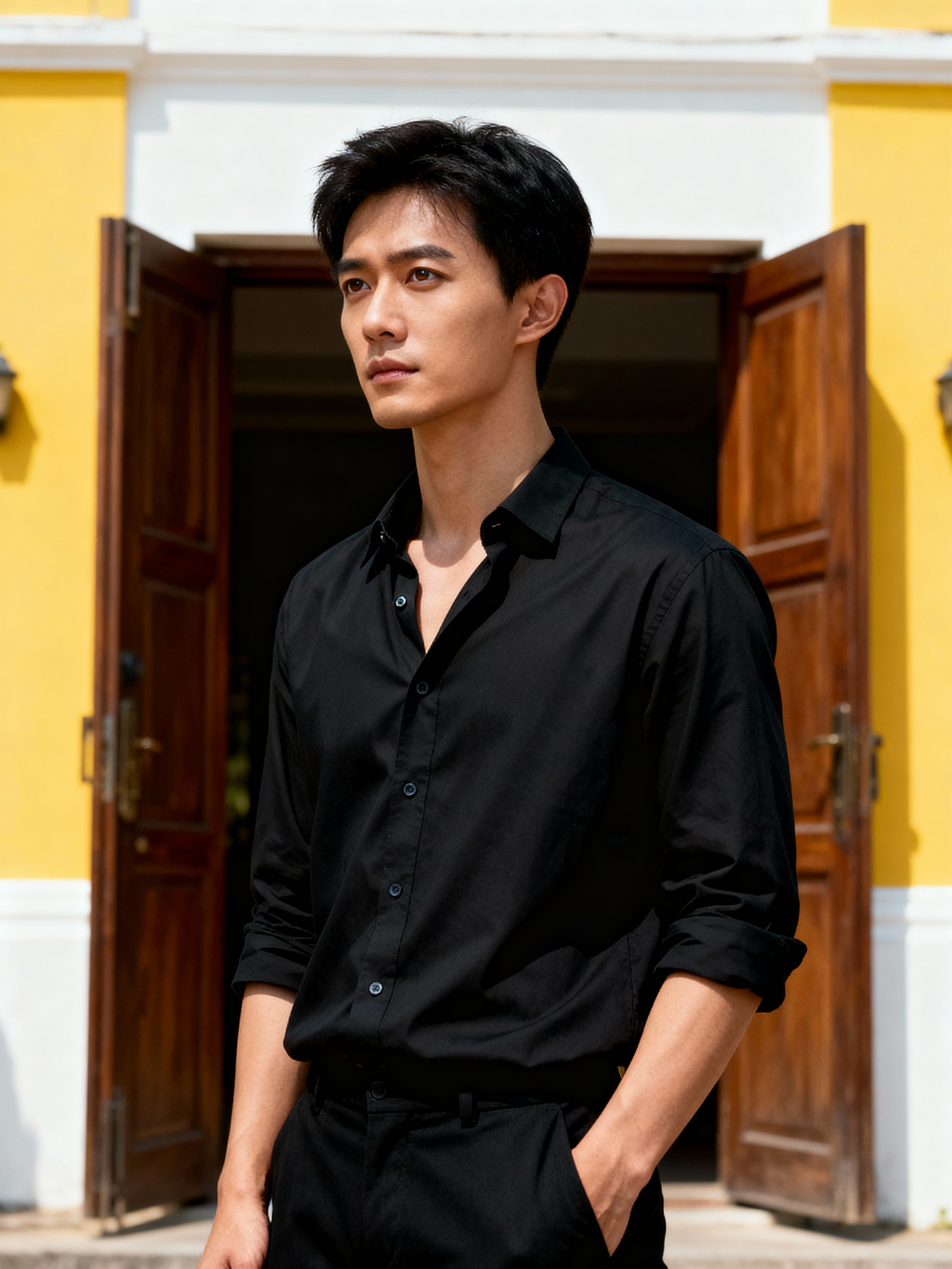 Front view of a model standing outdoors, looking slightly to the left. wearing a black, long-sleeve button-up shirt with the top button undone and the sleeves casually rolled up to the elbows. the left hand is in a pants pocket. in the background, an open wooden door and a yellow and white building facade are visible.