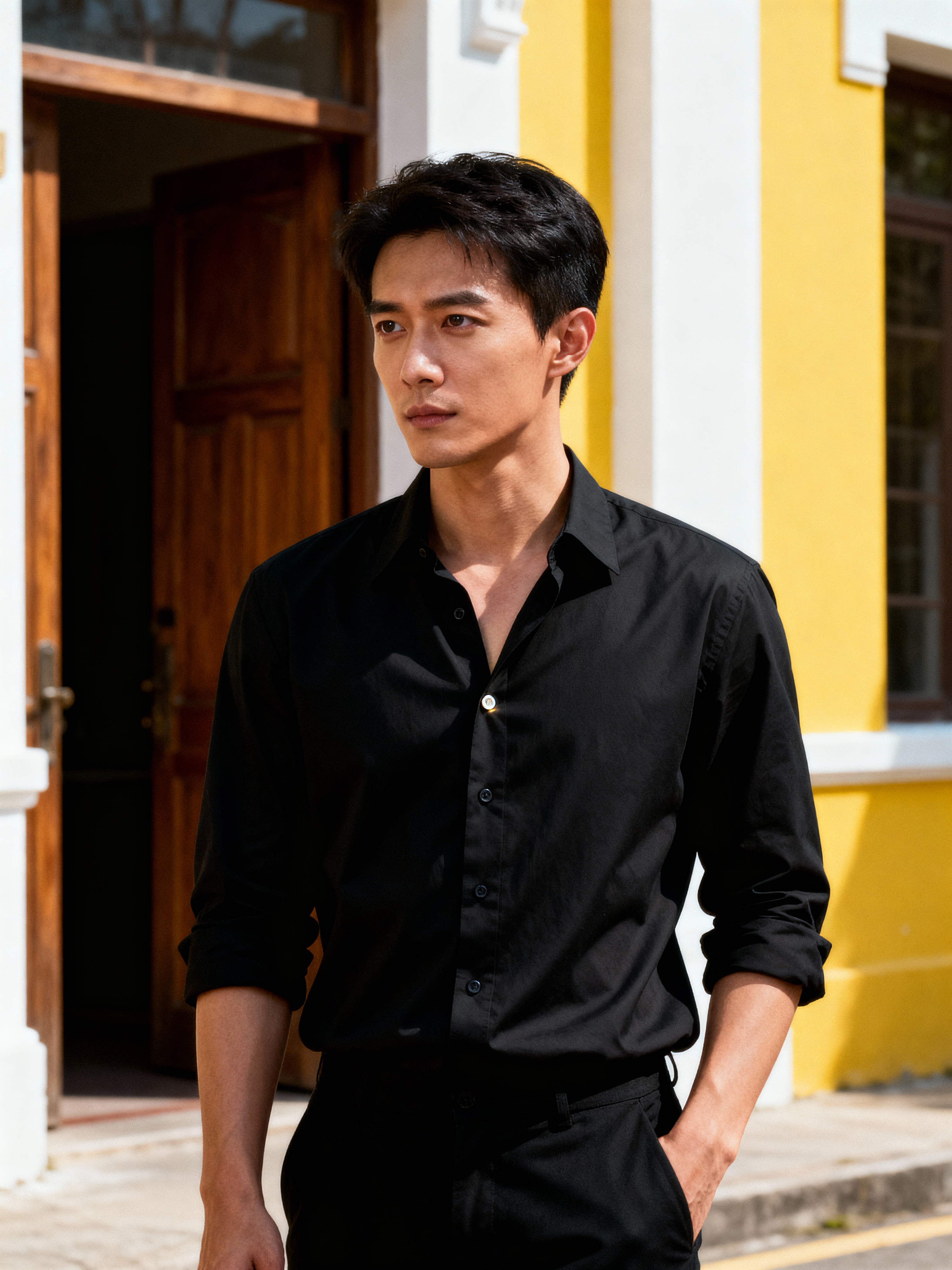 Front view of a model standing outdoors, looking slightly to the left. wearing a black, long-sleeve button-up shirt with the top button undone and the sleeves casually rolled up to the elbows. the left hand is in a pants pocket. in the background, an open wooden door and a yellow and white building facade are visible.