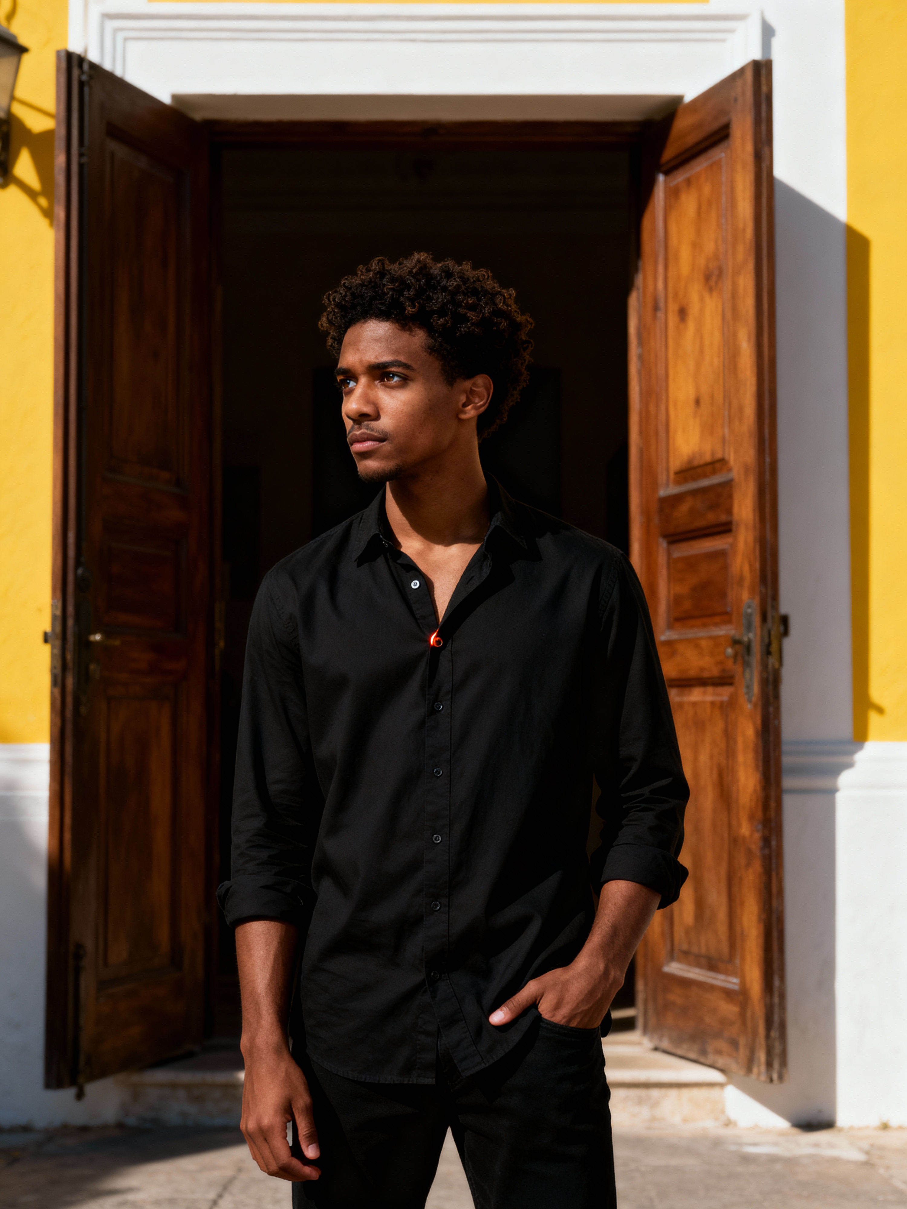 Front view of a model standing outdoors, looking slightly to the left. wearing a black, long-sleeve button-up shirt with the top button undone and the sleeves casually rolled up to the elbows. the left hand is in a pants pocket. in the background, an open wooden door and a yellow and white building facade are visible.