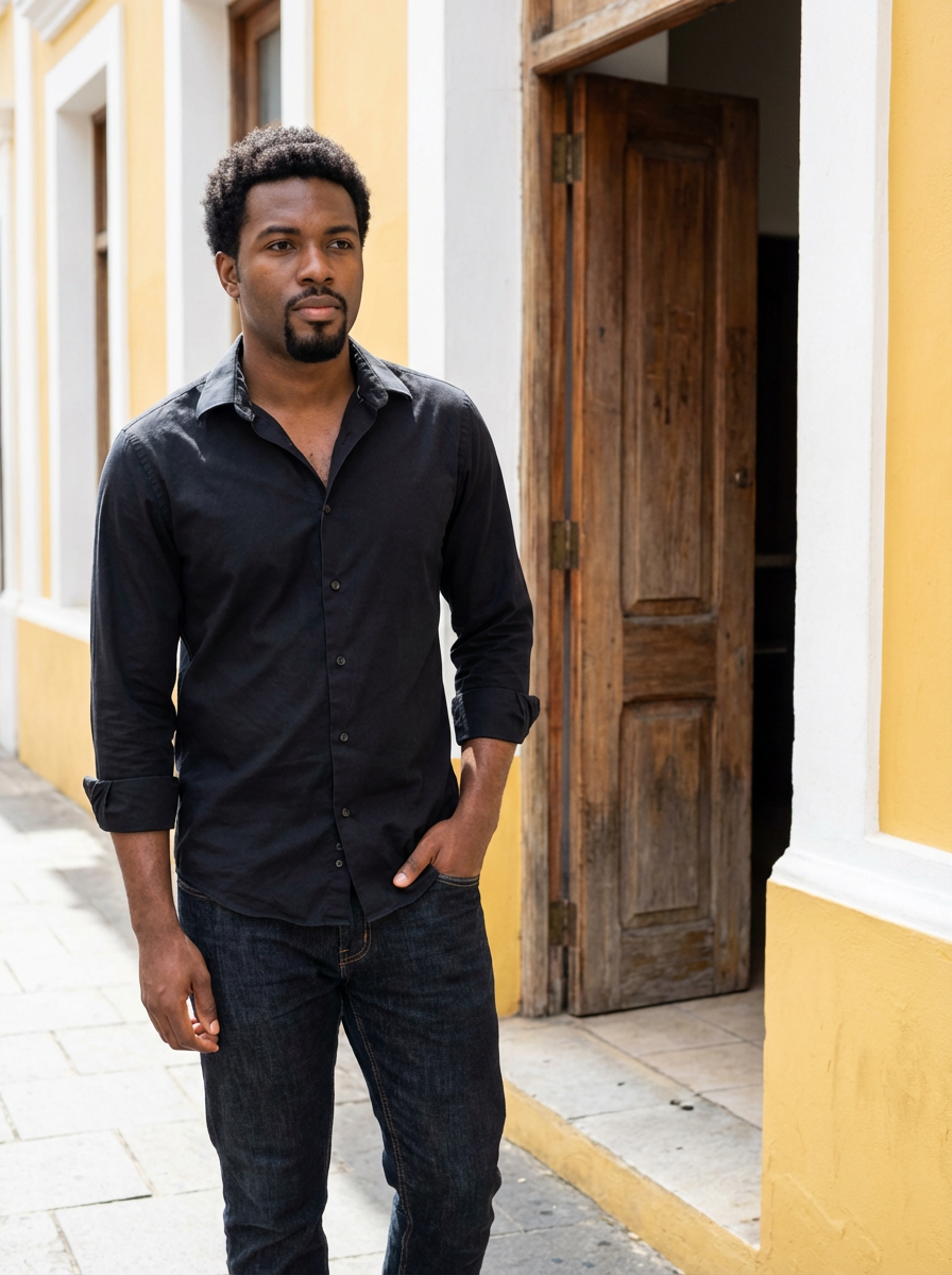 Front view of a model standing outdoors, looking slightly to the left. wearing a black, long-sleeve button-up shirt with the top button undone and the sleeves casually rolled up to the elbows. the left hand is in a pants pocket. in the background, an open wooden door and a yellow and white building facade are visible.