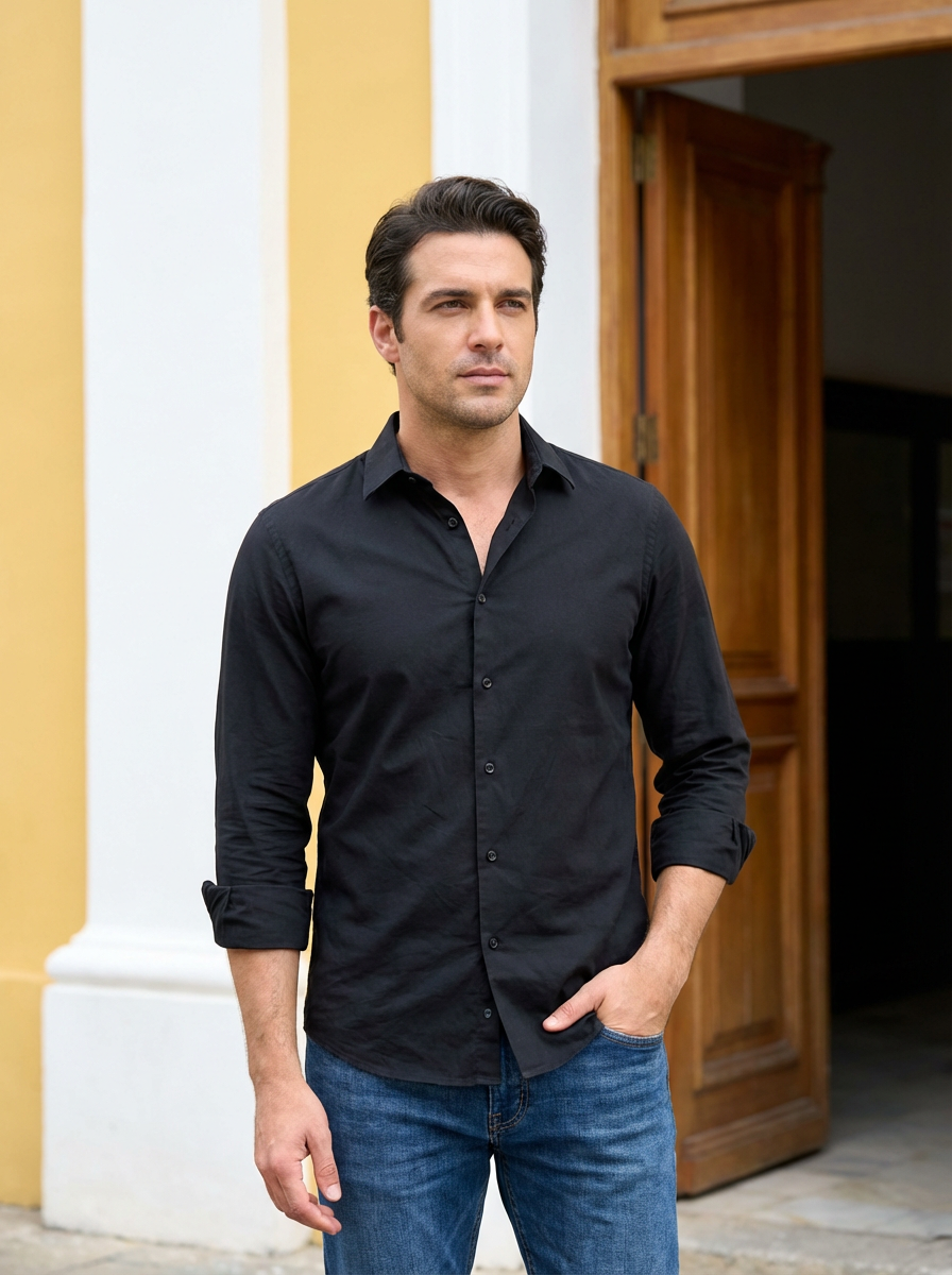 Front view of a model standing outdoors, looking slightly to the left. wearing a black, long-sleeve button-up shirt with the top button undone and the sleeves casually rolled up to the elbows. the left hand is in a pants pocket. in the background, an open wooden door and a yellow and white building facade are visible.