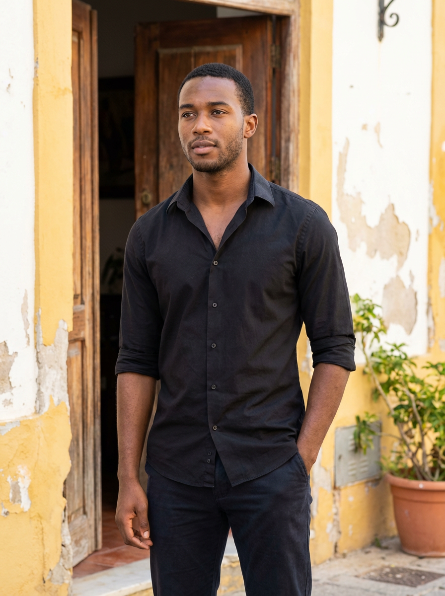 Front view of a model standing outdoors, looking slightly to the left. wearing a black, long-sleeve button-up shirt with the top button undone and the sleeves casually rolled up to the elbows. the left hand is in a pants pocket. in the background, an open wooden door and a yellow and white building facade are visible.