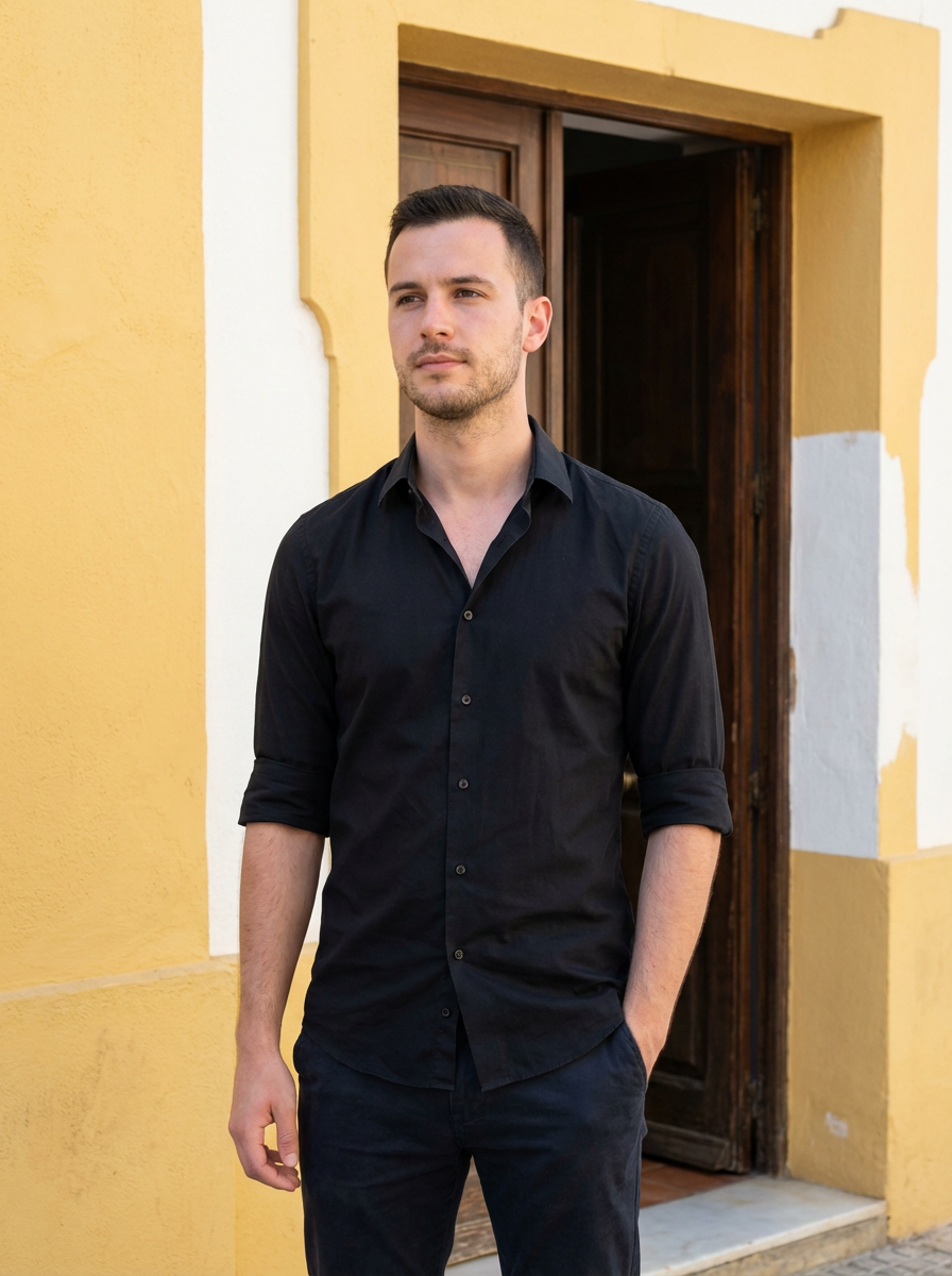Front view of a model standing outdoors, looking slightly to the left. wearing a black, long-sleeve button-up shirt with the top button undone and the sleeves casually rolled up to the elbows. the left hand is in a pants pocket. in the background, an open wooden door and a yellow and white building facade are visible.