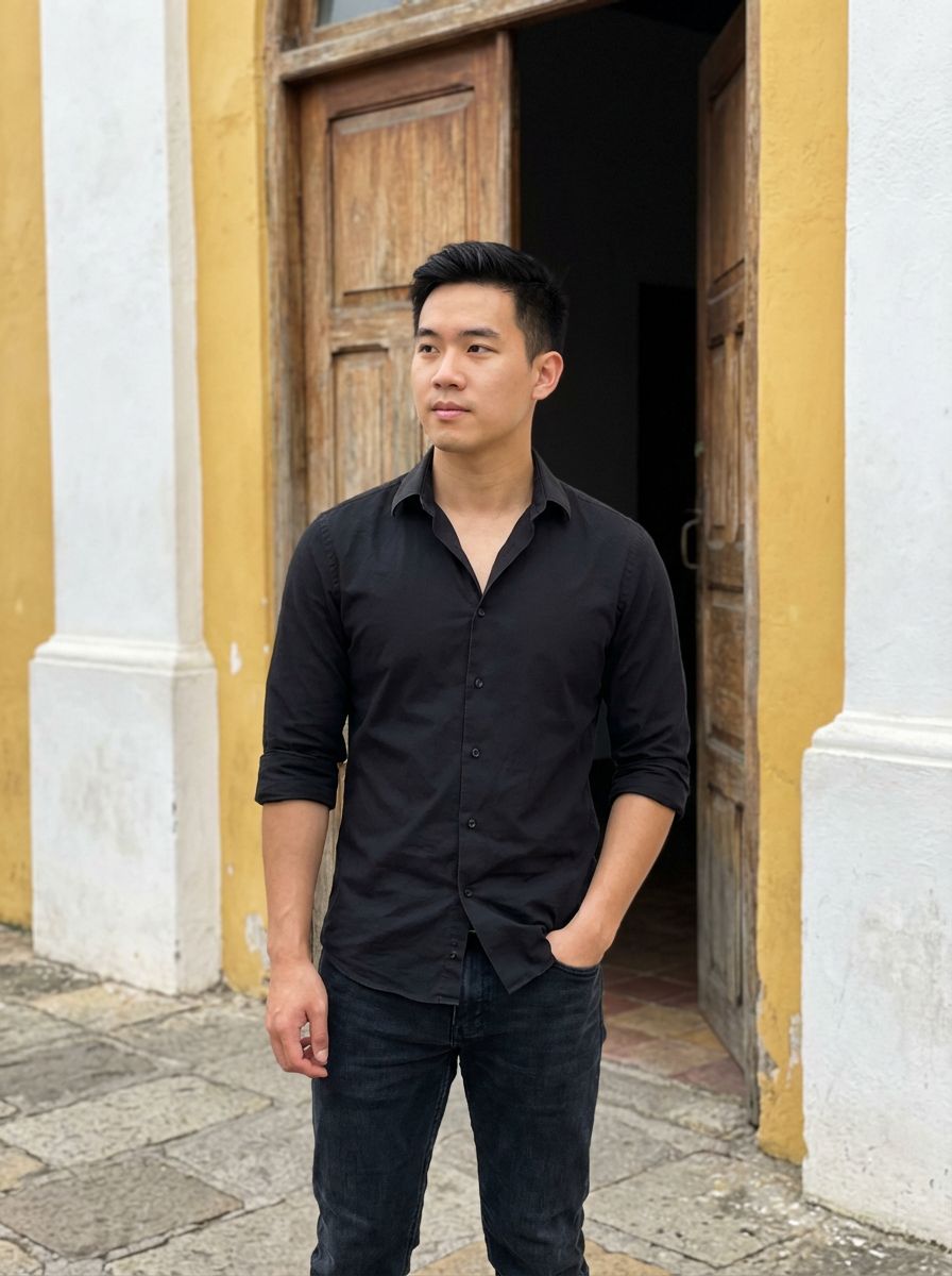 Front view of a model standing outdoors, looking slightly to the left. wearing a black, long-sleeve button-up shirt with the top button undone and the sleeves casually rolled up to the elbows. the left hand is in a pants pocket. in the background, an open wooden door and a yellow and white building facade are visible.