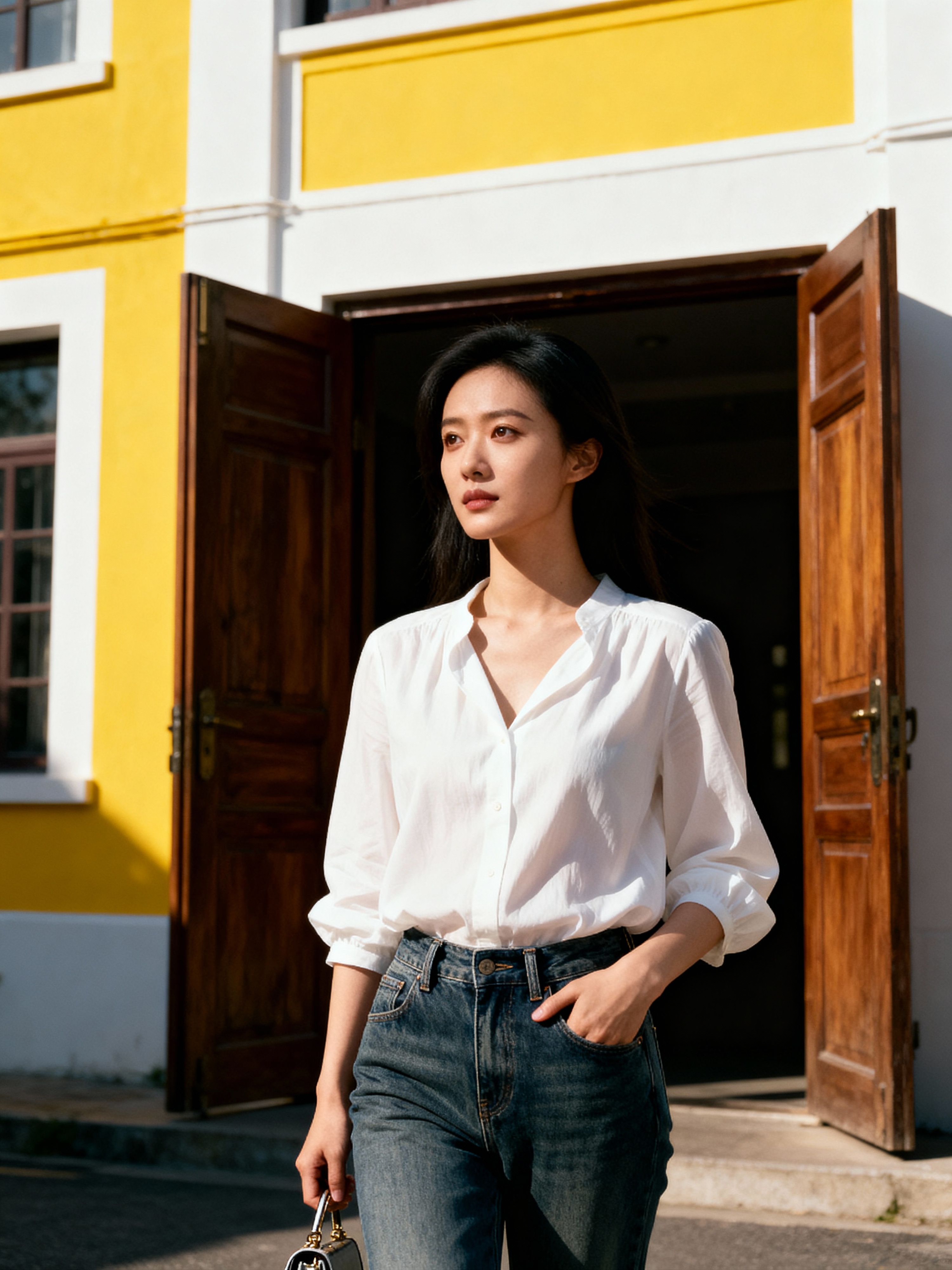 Front view of a model standing outdoors, looking slightly to the left. Wearing a white blouse, paired with high-waisted jeans, and holding a small purse in the left hand. the left hand is in a pants pocket. in the background, an open wooden door and a yellow and white building facade are visible.