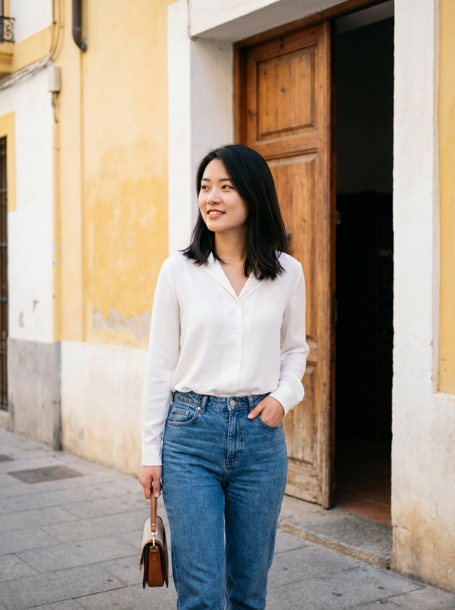 Front view of a model standing outdoors, looking slightly to the left. Wearing a white blouse, paired with high-waisted jeans, and holding a small purse in the left hand. the left hand is in a pants pocket. in the background, an open wooden door and a yellow and white building facade are visible.