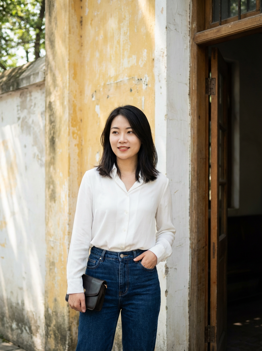 Front view of a model standing outdoors, looking slightly to the left. Wearing a white blouse, paired with high-waisted jeans, and holding a small purse in the left hand. the left hand is in a pants pocket. in the background, an open wooden door and a yellow and white building facade are visible.