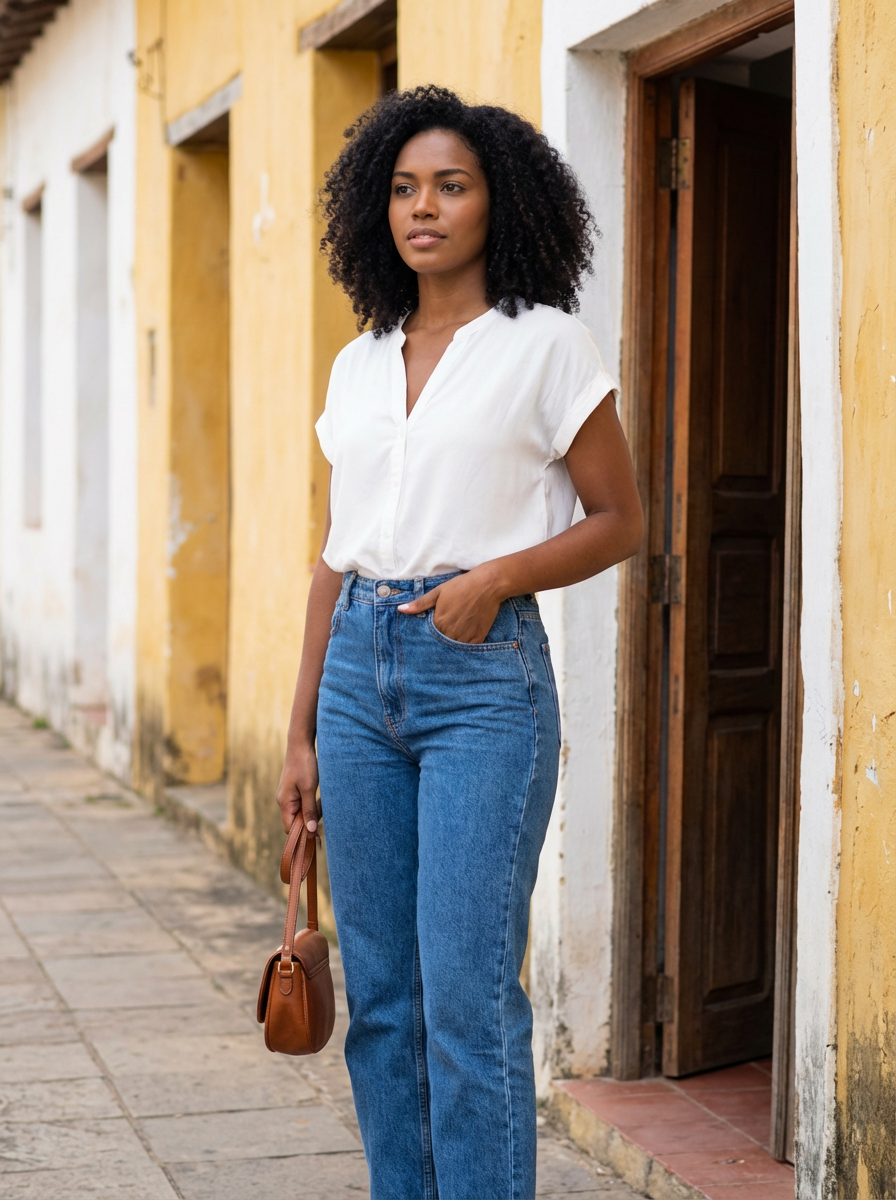 Front view of a model standing outdoors, looking slightly to the left. Wearing a white blouse, paired with high-waisted jeans, and holding a small purse in the left hand. the left hand is in a pants pocket. in the background, an open wooden door and a yellow and white building facade are visible.