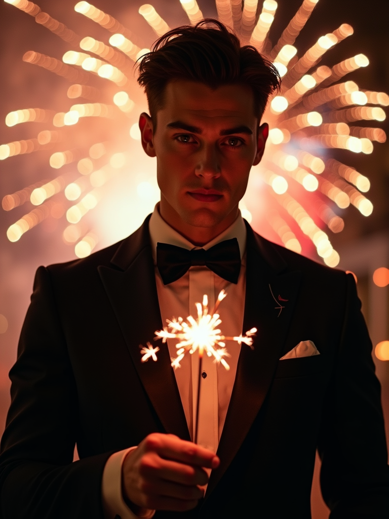 Front view of model in a sleek black tuxedo with a velvet bow tie. The model is holding a sparkler in a festive environment with colorful fireworks in the background. Cinematic lighting.