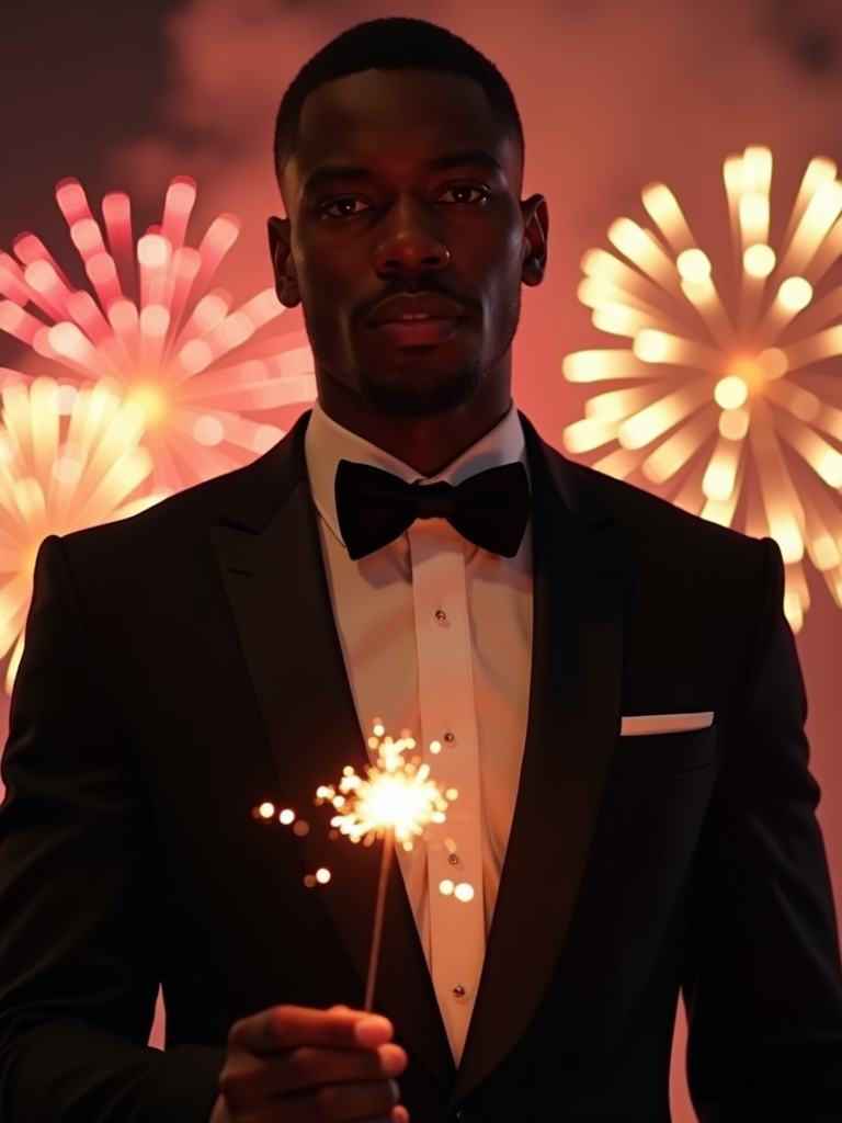 Front view of model in a sleek black tuxedo with a velvet bow tie. The model is holding a sparkler in a festive environment with colorful fireworks in the background. Cinematic lighting.